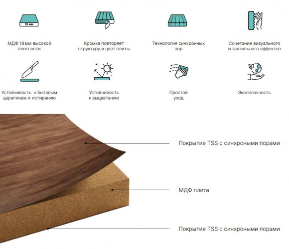 Коллекции FOREST выполнена из технологичных и прочных материалов: в основе – МДФ высокой плотности толщиной 18 мм. Класс эмиссии Е1. Фасады изготовлены по технологии TSS (термоструктурированные поверхности), которая включает в себя нанесение термореактивной смолы на декоративный слой плиты. Фасад становится невероятно прочным и устойчивым к механическим повреждениям. Фактура поверхности с высокой достоверностью имитирует благородные древесные, а также каменные и индустриальные текстуры. Такого эффекта удается достичь с помощью технологии синхронных пор. Она создаёт тактильный и визуальный эффекты текстурной поверхности и придает вашей мебели природную реалистичность. Обратная сторона фасадов идентична лицевой, кромка повторяет тиснение плиты. Материал устойчив к впитыванию пыли и грязи – его достаточно протереть влажной салфеткой. Фасады FOREST имеют высокую устойчивость к бытовым царапинам, истиранию и выцветанию декора.