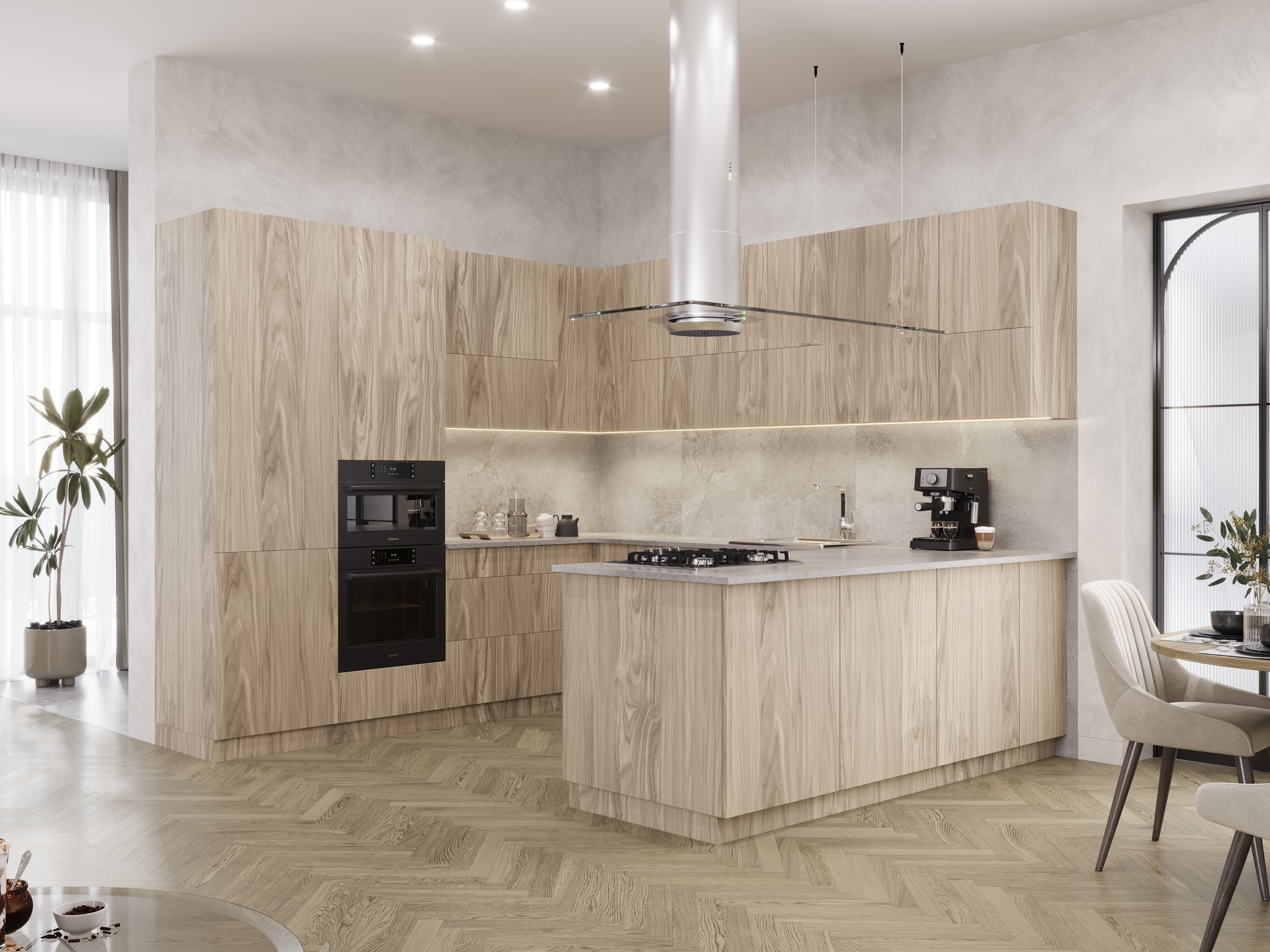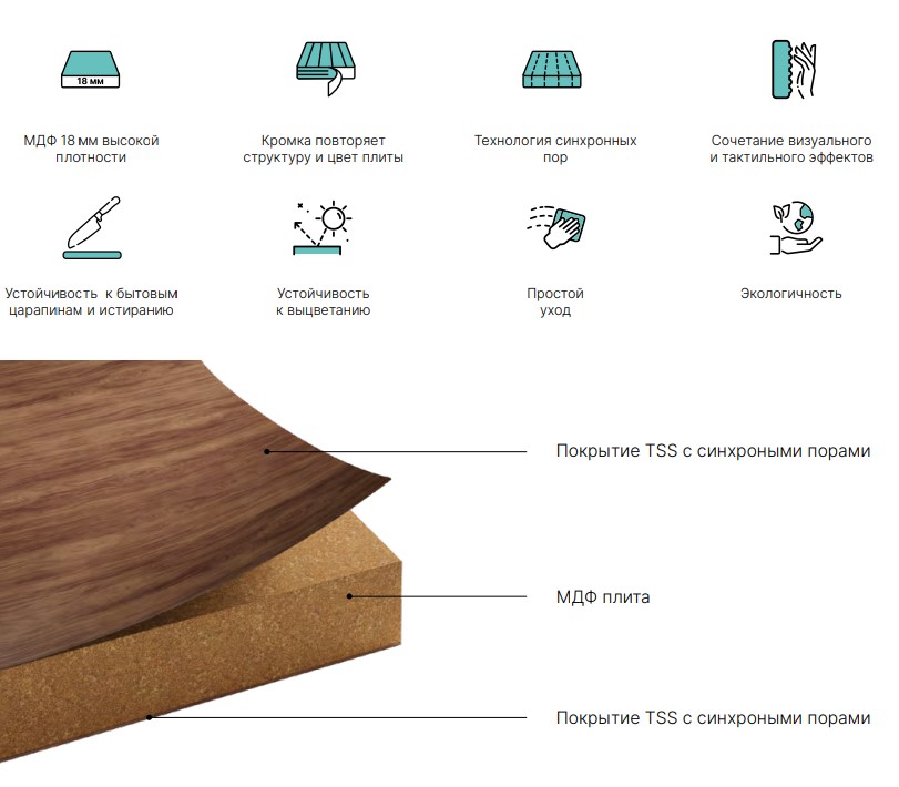 Коллекции FOREST выполнена из технологичных и прочных материалов: в основе – МДФ высокой плотности толщиной 18 мм. Класс эмиссии Е1. Фасады изготовлены по технологии TSS (термоструктурированные поверхности), которая включает в себя нанесение термореактивной смолы на декоративный слой плиты. Фасад становится невероятно прочным и устойчивым к механическим повреждениям. Фактура поверхности с высокой достоверностью имитирует благородные древесные, а также каменные и индустриальные текстуры. Такого эффекта удается достичь с помощью технологии синхронных пор. Она создаёт тактильный и визуальный эффекты текстурной поверхности и придает вашей мебели природную реалистичность. Обратная сторона фасадов идентична лицевой, кромка повторяет тиснение плиты. Материал устойчив к впитыванию пыли и грязи – его достаточно протереть влажной салфеткой. Фасады FOREST имеют высокую устойчивость к бытовым царапинам, истиранию и выцветанию декора.
