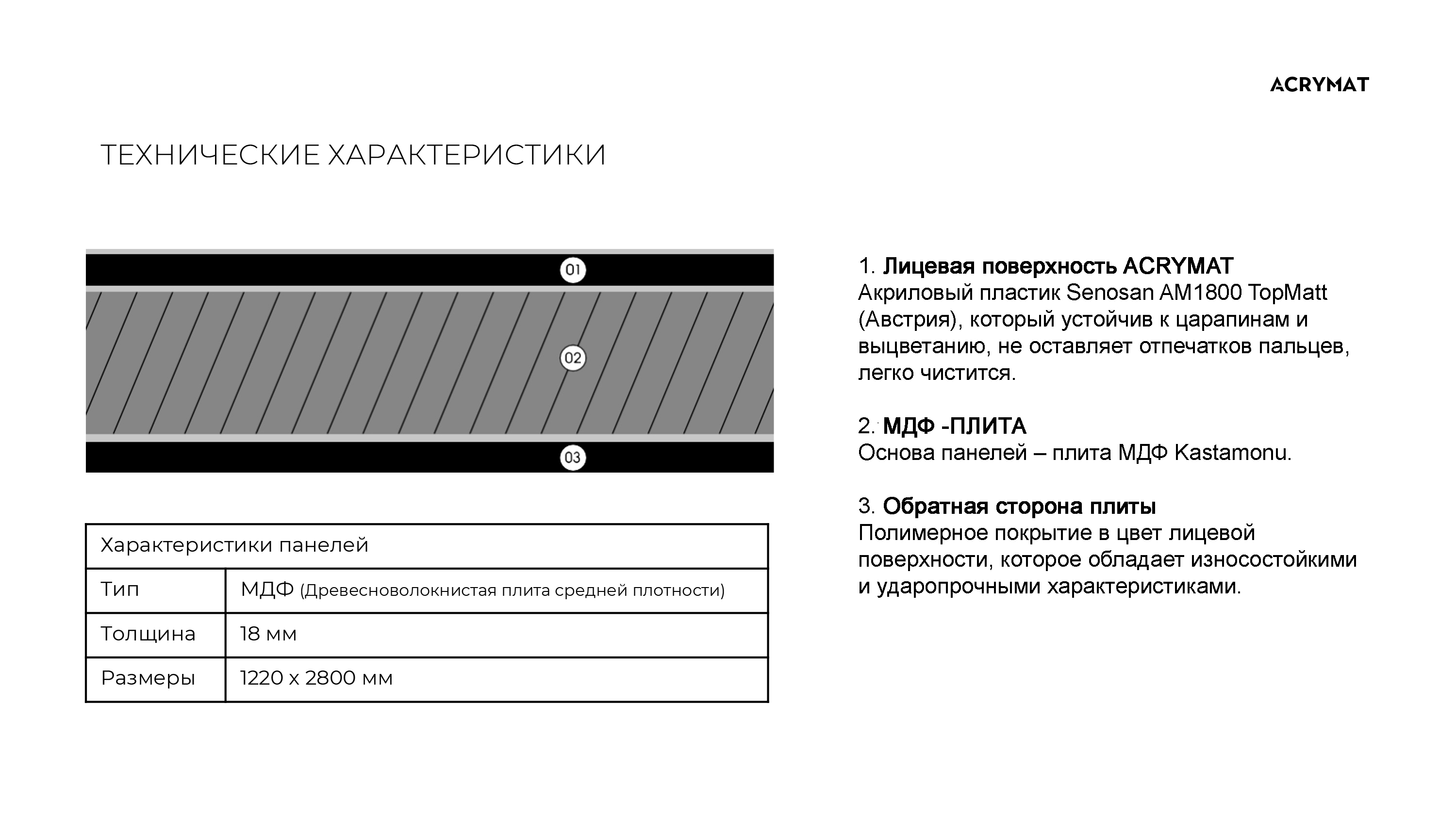 Экстраматовые панели ACRYMAT - это панели с декоративной экстраматовой поверхностью, произведенные по передовым уникальным технологиям. В дополнение к мягкости на ощупь, изделия с высокой устойчивостью к отпечаткам пальцев и легкие в чистке подчеркивают благородную матовость поверхности. Благодаря данной технологии производства, основанной на принципе экстраматовости и качества, панели уникальны и не имеют себе равных. Панели Acrymat производятся на основе МДФ. Лицевое покрытие поверхности сделано из акрила. Покрытие имеет высокие стандарты качества и защищено от царапин. Внутренняя сторона панели также имеет надежное покрытие. СОСТАВ ПАНЕЛИ: 1. ПОКРЫТИЕ ДЕКОРАТИВНОЙ СТОРОНЫ Устойчивое к царапинам и выцветанию суперматовое акриловое покрытие AM1800TopMatt AF от Senosan. 2. МДФ -ПЛИТА 3. ПОКРЫТИЕ ВНУТРЕННЕЙ СТОРОНЫ Покрытие на полимерной основе, обладающее высокими износостойкими и ударопрочными характеристиками. ТЕХНИЧЕСКИЕ ХАРАКТЕРИСТИКИ: Тип панели - МДФ Толщина - 18 мм Размеры - 1220 х 2800 мм
