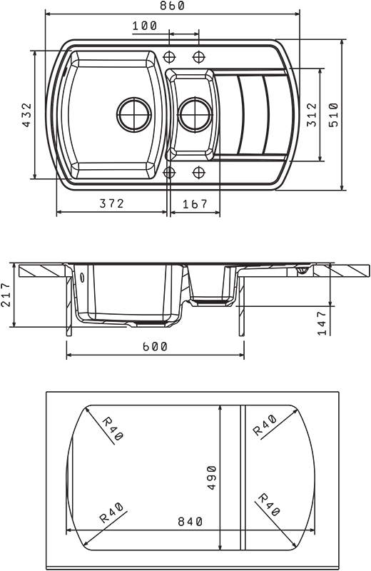 Отводная арматура для двух разноуровневых чаш с выпусками 3 ½ ” (D=90мм) и переливом |
