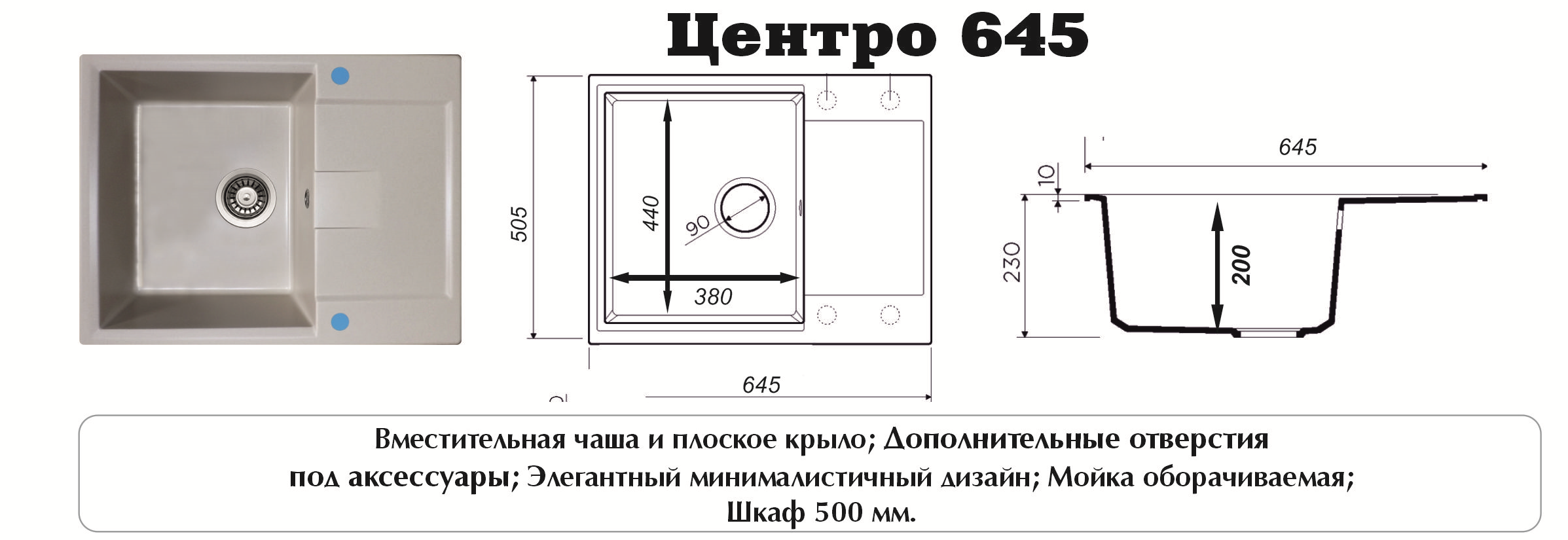 - Вместительная чаша и плоское крыло. - Дополнительные отверстия под аксессуары. - Элегантный минималистичный дизайн. - Мойка оборачиваемая. - Шкаф 500мм.