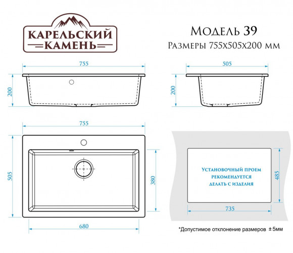 Мойка Модель 39, 755х505х200мм, Темно-Серый Q8 Мрамор