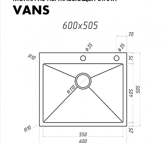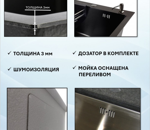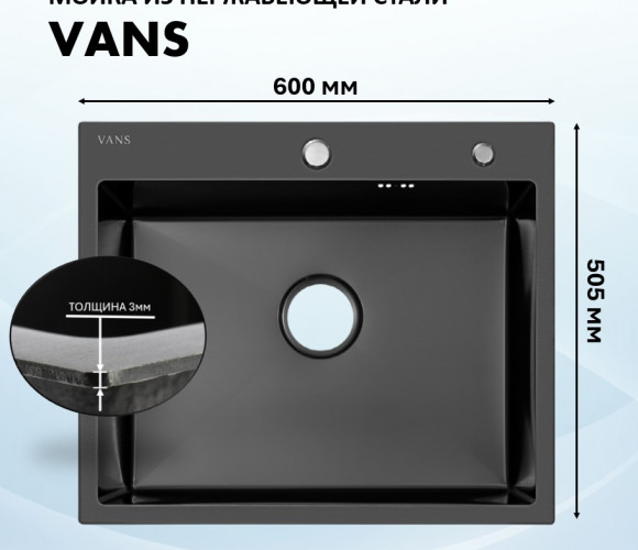 Мойка VANS (600х505х200мм, толщ.3мм), BLACK + ДОЗАТОР
