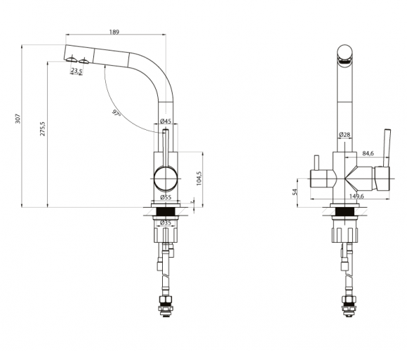 Смеситель кухонный однорычажный с высоким поворотным изливом и тремя каналами. Третий канал предназначен для подачи чистой питьевой воды. Управление третьим каналом осуществляется с помощью отдельного рычага.