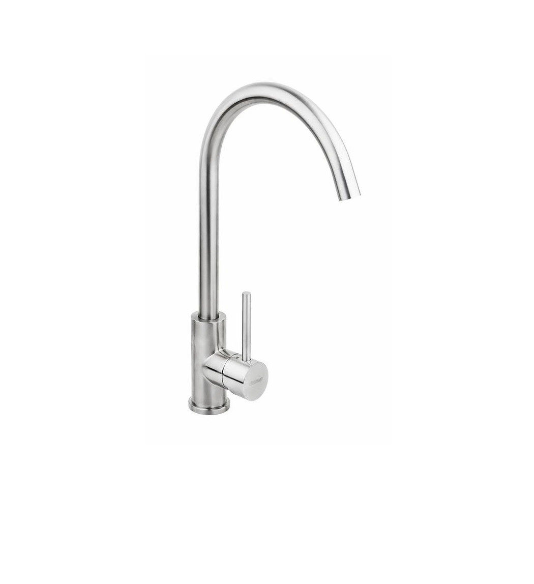 Практичный современный смеситель для кухни с высоким поворотным изливом и утолщенным основанием.