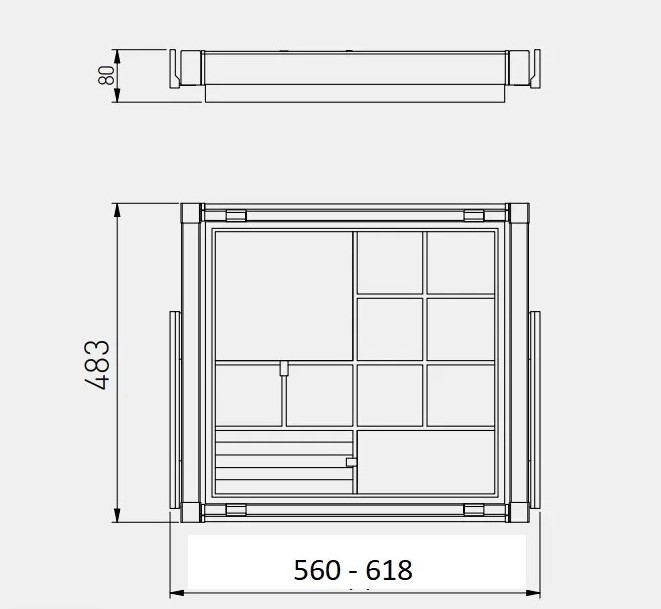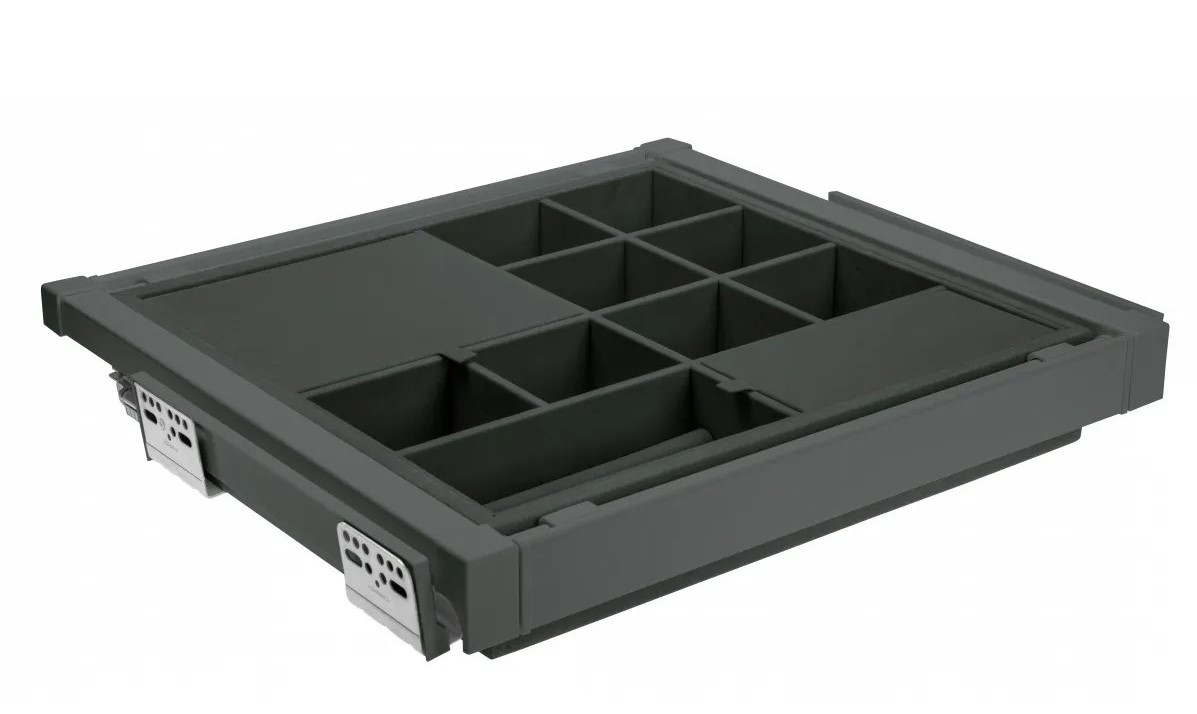 Корзина с органайзером ELITE WG-PRZEG60-60-A, в модуль 600 мм, антрацит - удобное гардеробное наполнение, предназначенное для хранения аксессуаров, таких как украшения, заколки, часы, ремни, запонки и прочие мелочи. Рабочая поверхность корзины разделена на секции. Корзина предназначена для модуля с шириной фасада 600 мм, вид монтажа направляющих - нижний (скрытый). Ширина корзины регулируется в диапазоне 560 - 618 мм. КОМПЛЕКТАЦИЯ Корзина - 1 шт. Шариковые направляющие 450 мм (левая и правая) с доводчиком - 1 комплект. Набор креплений для монтажа - 1 комплект. ПРЕИМУЩЕСТВА Благодаря доводчику, корзина плавно и бесшумно задвигается в шкаф. Механизм полного выдвижения обеспечивает легкий доступ к любой вещи в корзине.