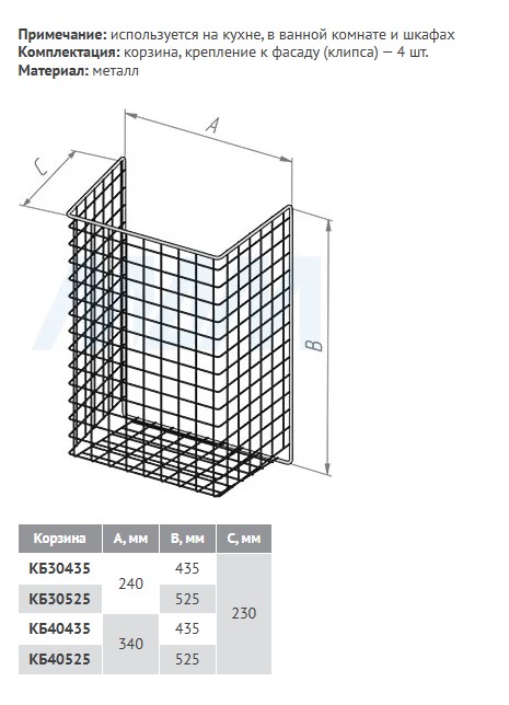 Комплектация: корзина, крепление к фасаду (клипса) — 4 шт.