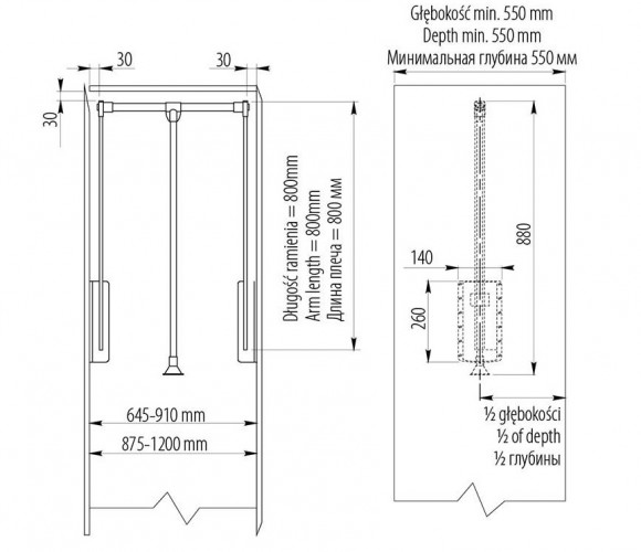 - Телескопическая штанга перед установкой в шкаф регулируется в пределах 60-83 см.
