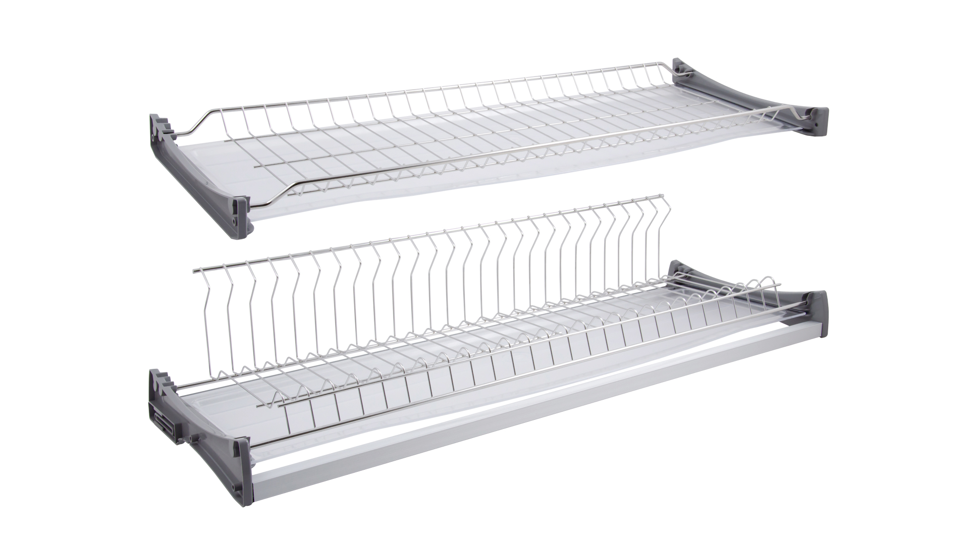 LORA SU06 — двухуровневая сушка для посуды из нержавеющей стали с нижним ярусом L-образной формы для более стабильного удержания разноформатных тарелок. Модель имеет два плотных поддона под каждым уровнем для сбора капель воды, стекающих с посуды. Нижний ярус оснащён поперечным прутком, который препятствует проваливанию маленьких блюдец.