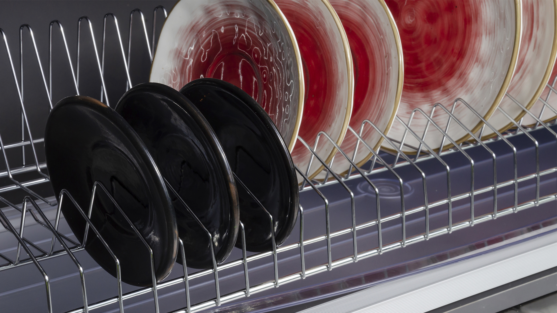 Особая форма прутков нижнего уровня позволяет по-настоящему удобно расположить в пространстве сушки большое количество посуды любого диаметра – от крошечных кофейных блюдец до габаритных сервировочных тарелок. При этом необязательно размещать посуду по центру, удобно ставить её и в дальние, и в ближние сектора сушки.