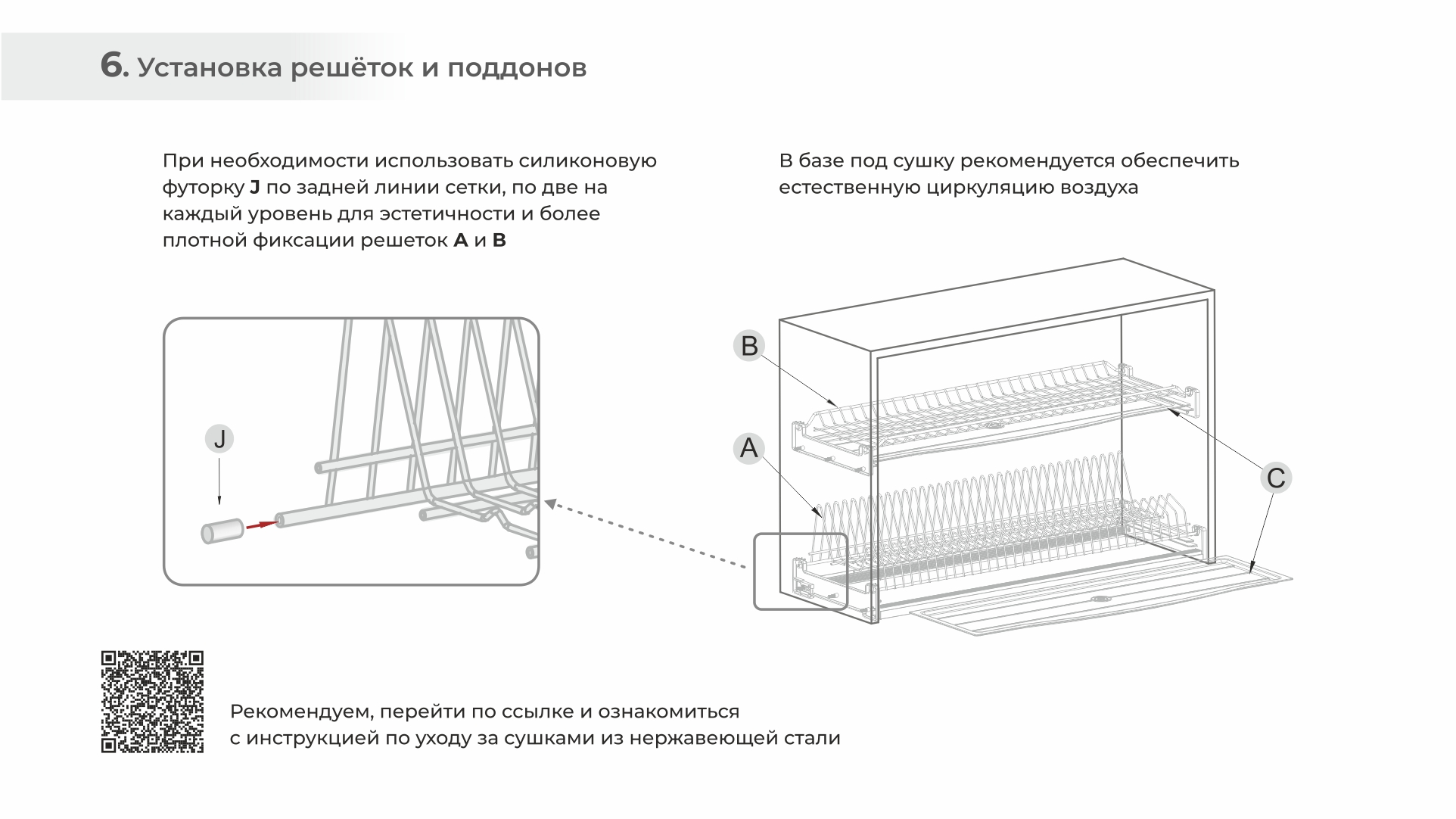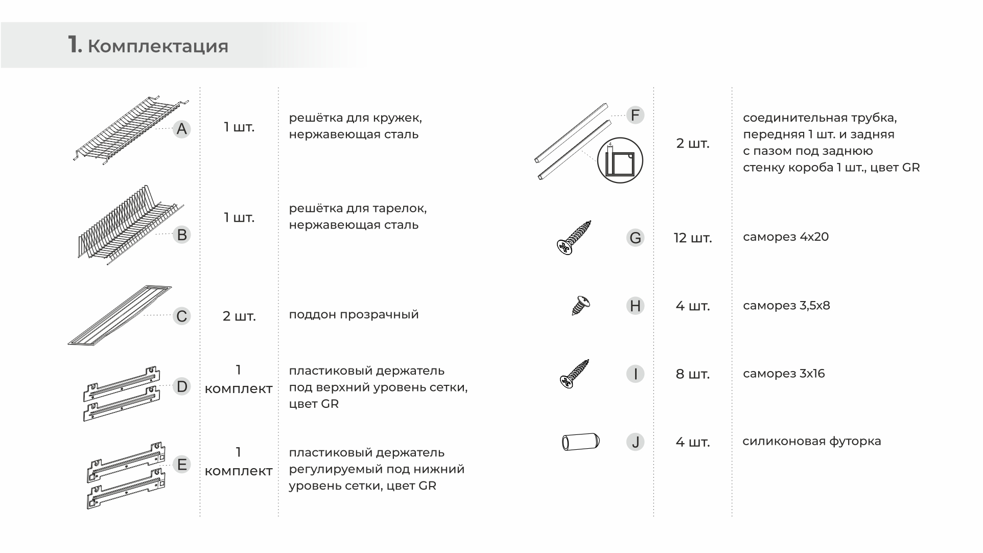 В комплект входит: решётка для кружек, решётка для тарелок, 2 съёмных пластиковых поддона нейтрального оттенка, 2 комплекта пластиковых держателей нижнего и верхнего уровня, 2 соединительных трубки, саморезы M4x20 – 12 штук, саморезы 3,5х8 – 4 штуки, саморезы 3х16 – 8 штук, силиконовые футорки – 4 штуки.