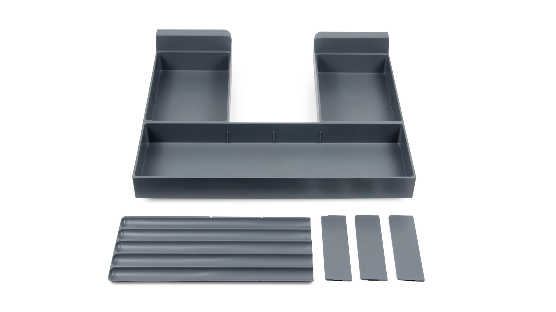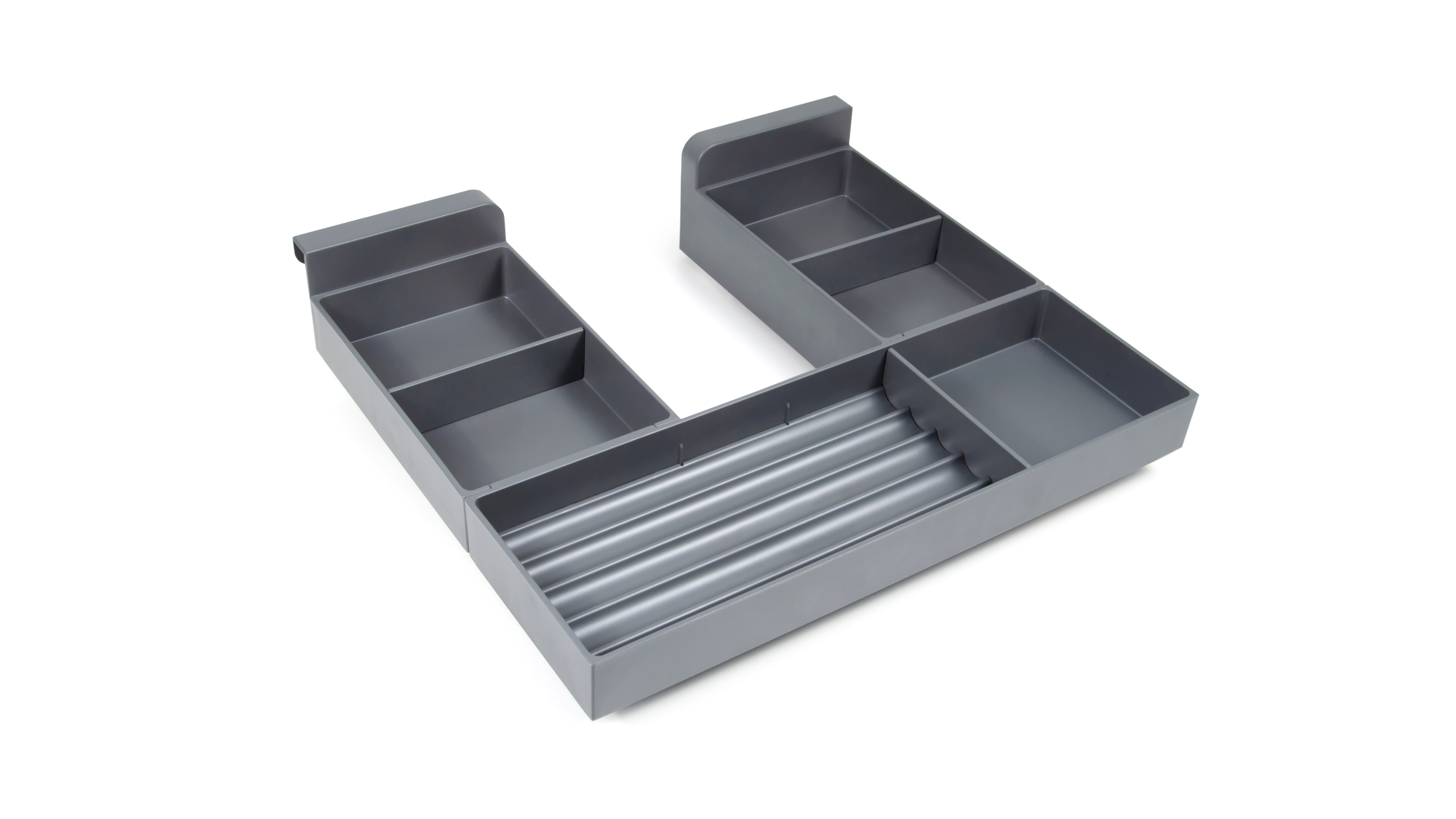 Модель оснащена специальными делителями, которые позволяют организовывать пространство и делить его на разные отсеки внутри поддонов под определённый размер для хранения: расчёсок, салфеток, баночек и других небольших предметов. Для среднего отсека в комплекте предусмотрена рифлёная вставка для зубных щёток.