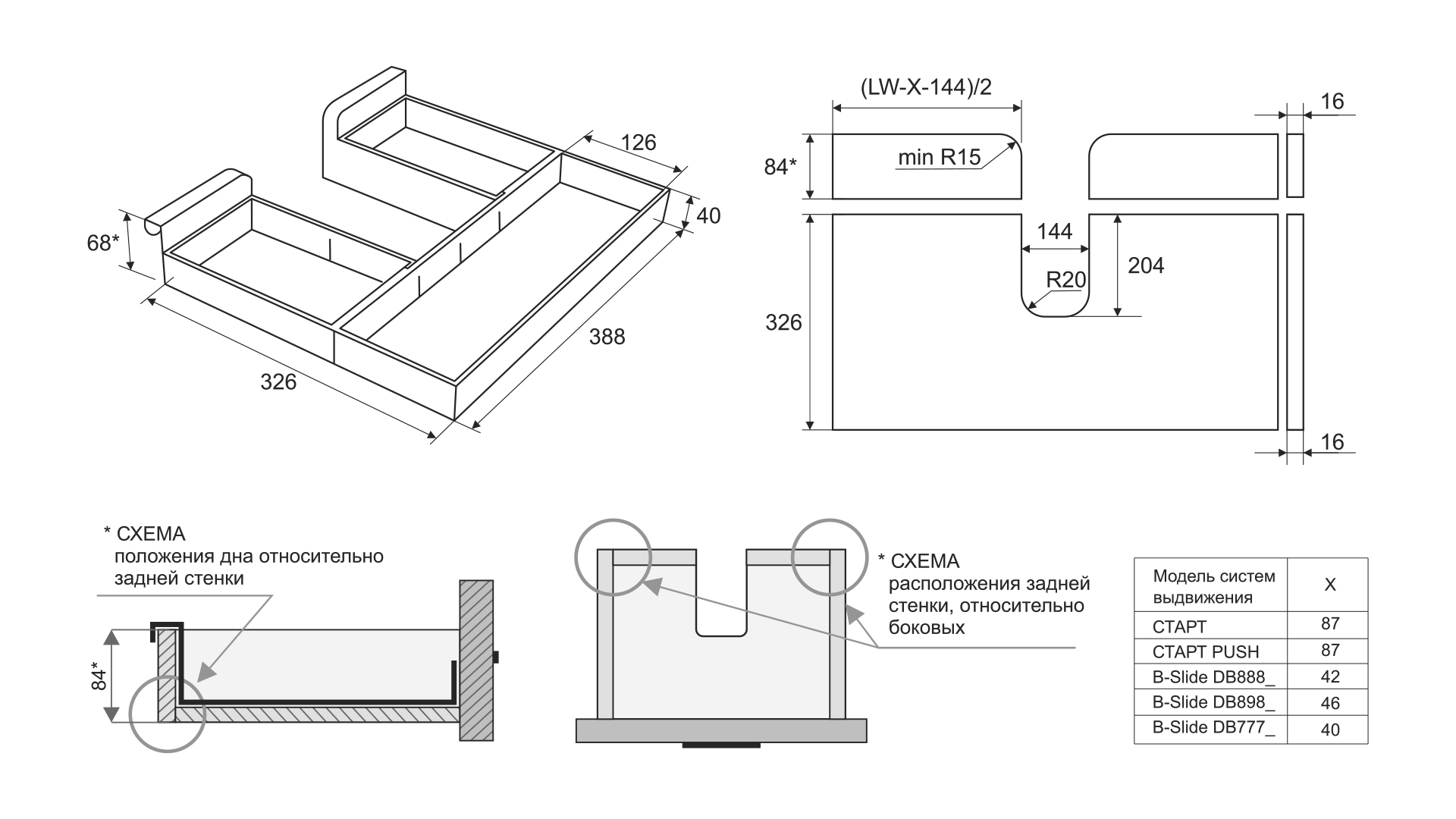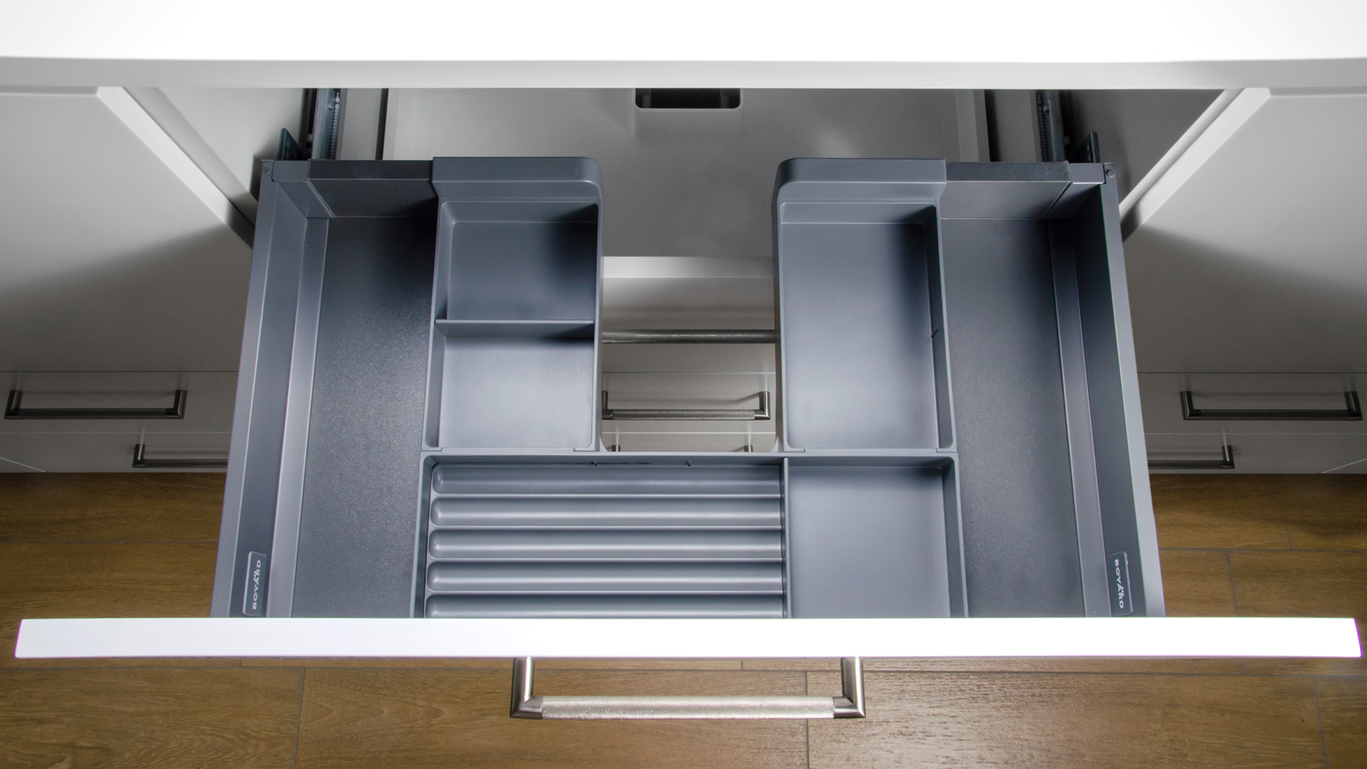 Конструкция органайзера — самостоятельный держатель задней стенки, а внутренние стенки, которые идут в комплекте — заполнят пространство внутри мебельного ящика. Торцы отверстия при этом будут закрыты конструкцией боковых деталей SBH70, что позволит сохранить эстетичность изделия.