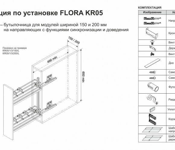 FLORA может быть установлена на левую или правую боковину модуля с помощью направляющих нового поколения с синхронизацией и доводчиком длиной 450 мм, которые обеспечивают легкое, равномерное и бесшумное движение бутылочницы. Система обеспечивают удобную трехмерную регулировку положения фасада.