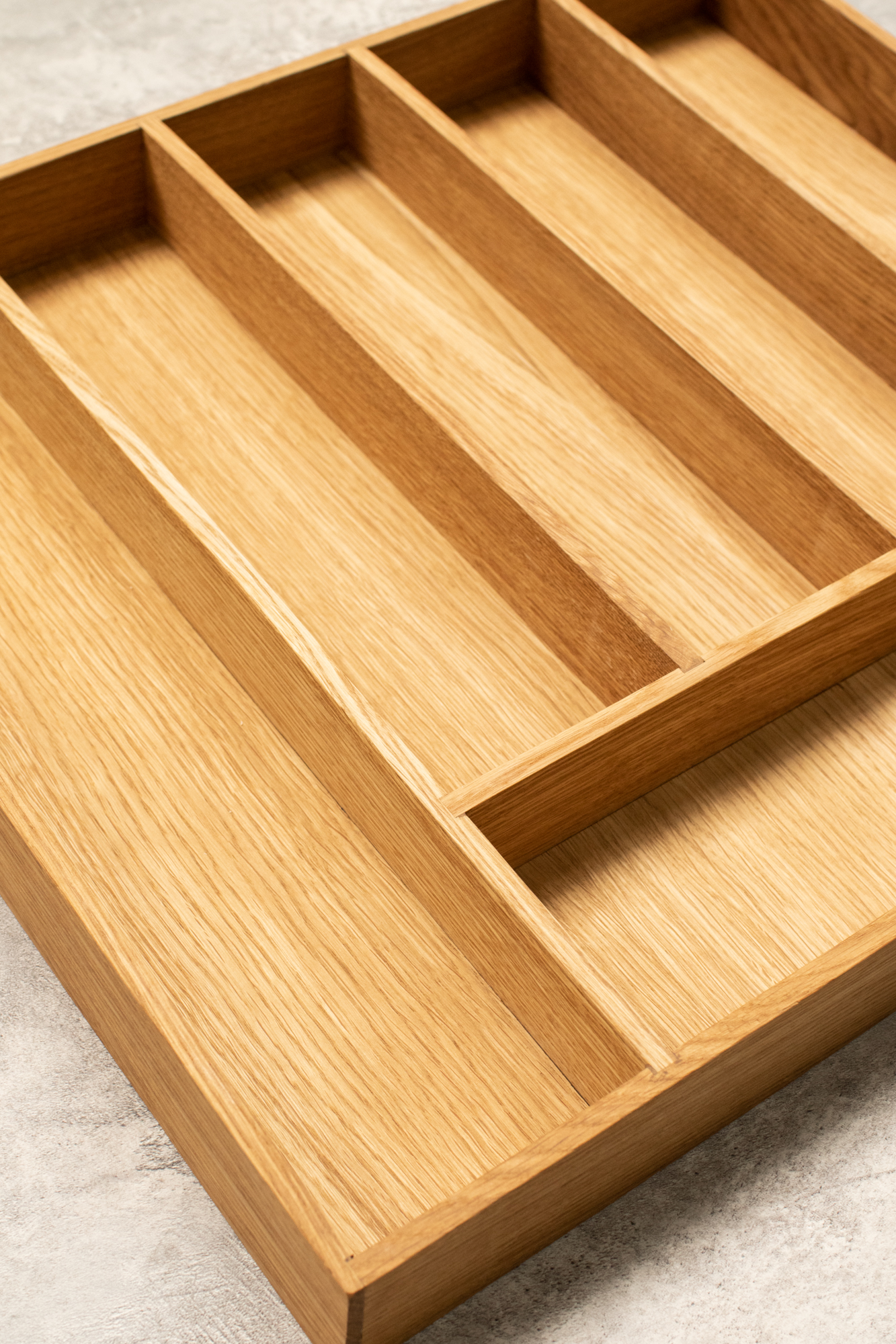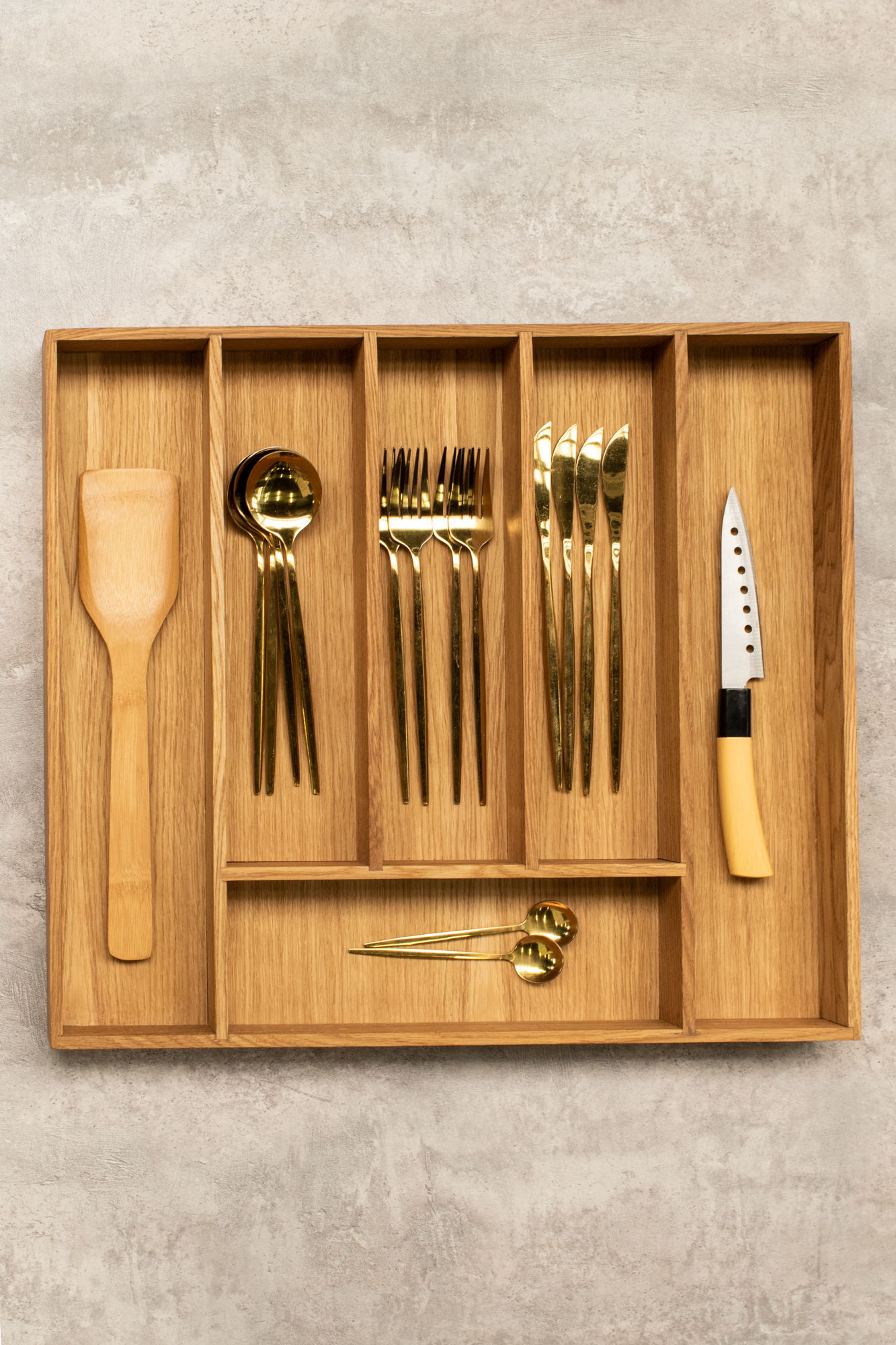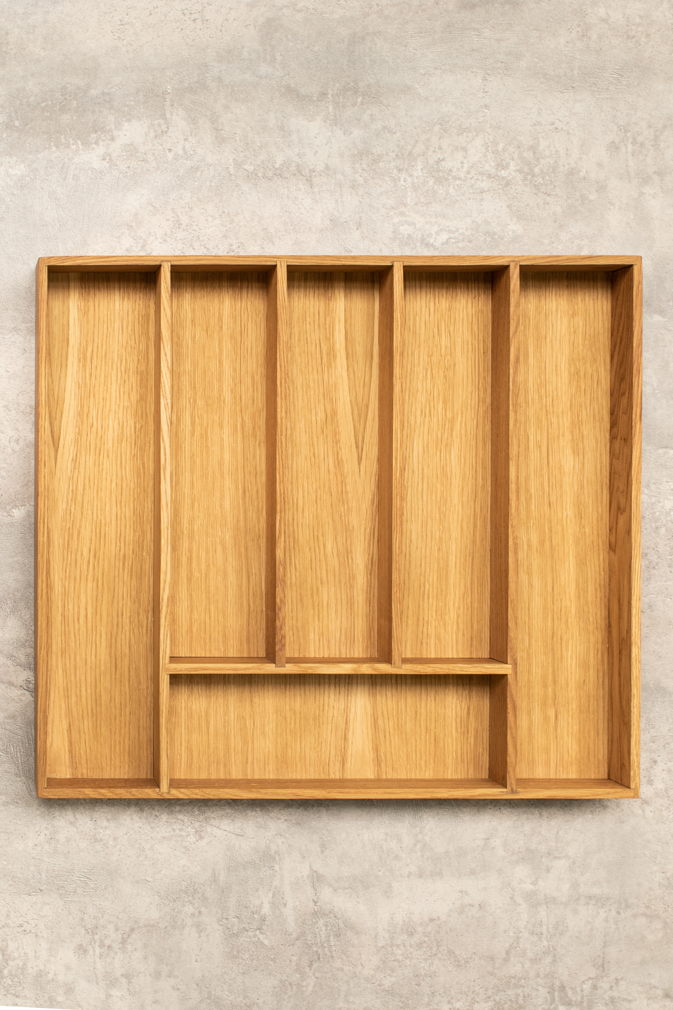 Вкладыш для столовых приборов выполнен из экологически чистого прочного дерева -дуб, материал не впитывает запахи, легко моется, не деформируется. Удобное приспособление для организации кухонного пространства. Подставка для столовых приборов вместительная и компактная, сохранит порядок и не займет много места, идеально подойдет для ящика кухонного гарнитура. Вкладыш для ножей универсальный приобретается отдельно.