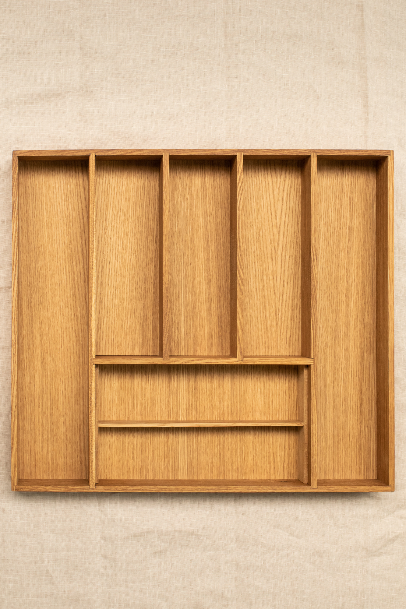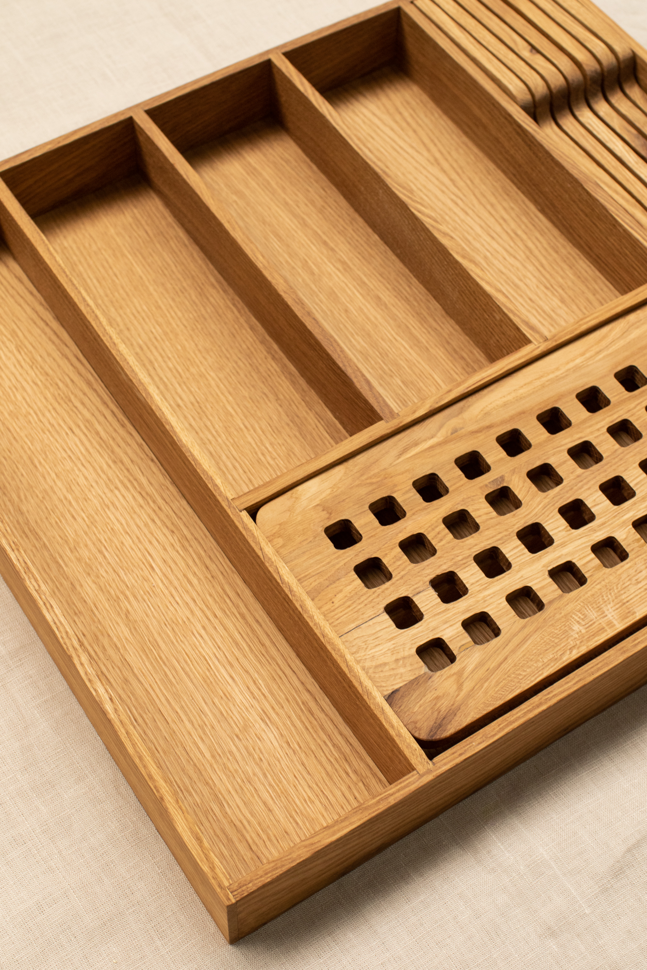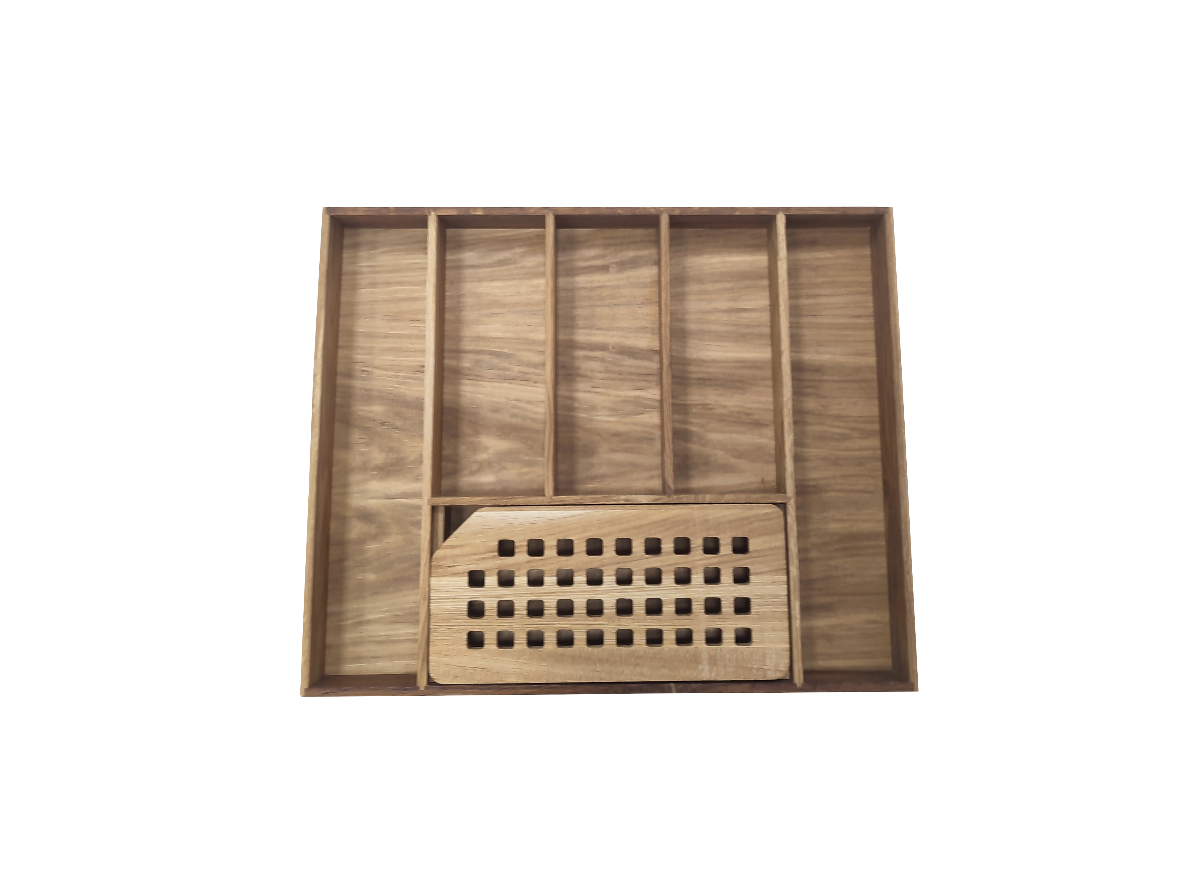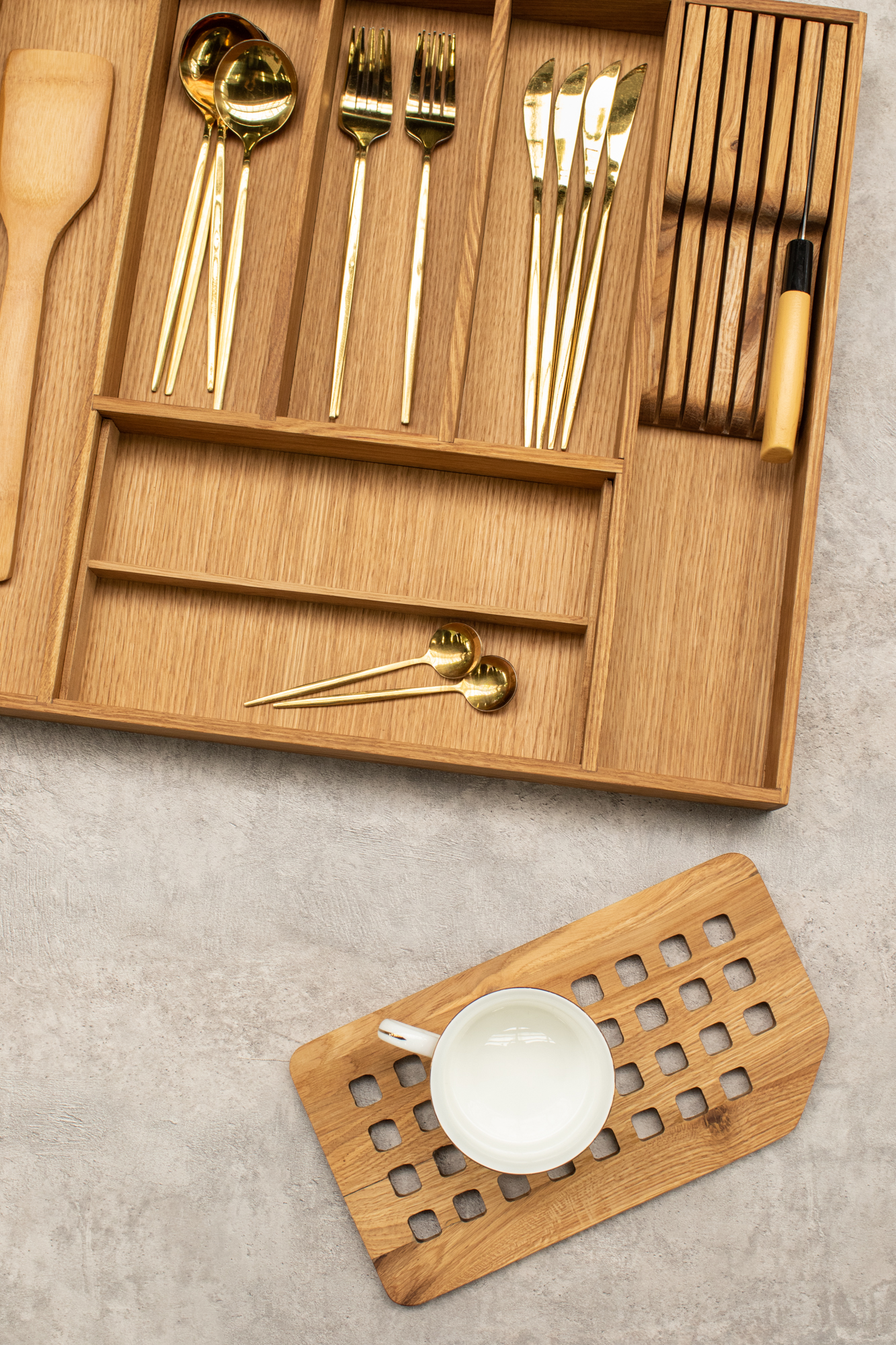 Вкладыш для столовых приборов выполнен из экологически чистого прочного дерева -дуб, материал не впитывает запахи, легко моется, не деформируется. Удобное приспособление для организации кухонного пространства. Подставка для столовых приборов вместительная и компактная, сохранит порядок и не займет много места, идеально подойдет для ящика кухонного гарнитура. Вкладыш для ножей универсальный приобретается отдельно.