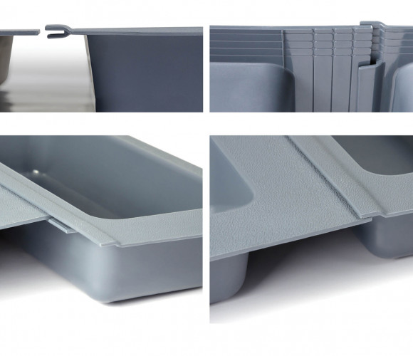 PC13 — широкий поддон из экологичного полипропилена, необходим для хранения столовых приборов. Является составным элементом для формирования индивидуальной комбинации поддонов линейки BL?KI для выдвижных мебельных ящиков глубиной 450 мм и шириной от 500 мм.