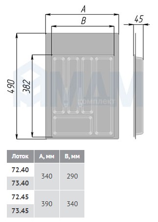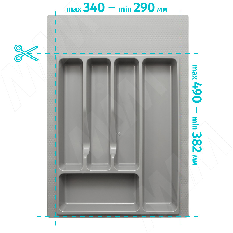 Применение: лоток универсальный — для использования с различными ящиками может потребоваться обрезка, максимальные размеры лотка и минимально возможные размеры для обрезки показаны на схеме