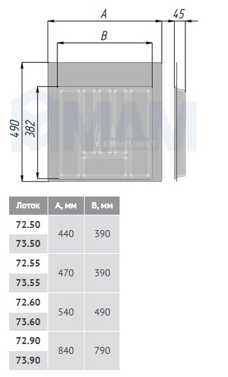 Применение: лоток универсальный — для использования с различными ящиками может потребоваться обрезка, максимальные размеры лотка и минимально возможные размеры для обрезки показаны на схеме