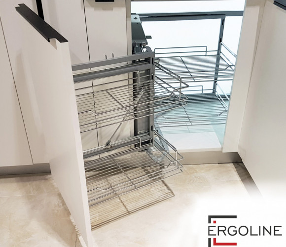 Универсальный «волшебный уголок» UniVerse KRM04 с поворотно-выкатным механизмом создан для рационального использования незадействованных угловых ниш и позволяет эргономично разместить множество предметов быта, включая посуду и технику.