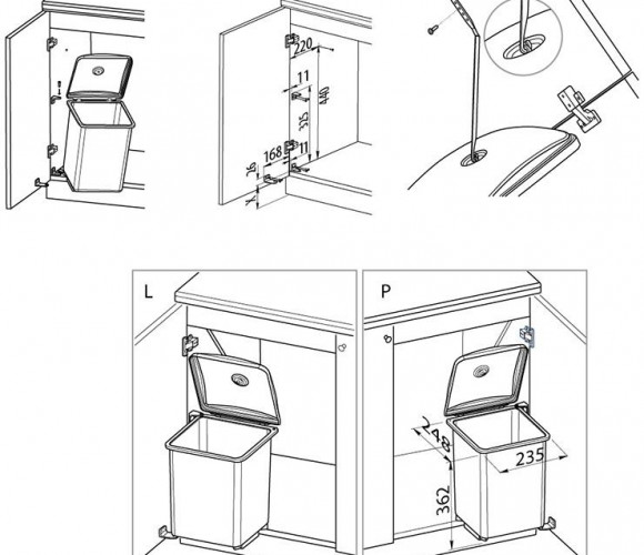 Ведро может быть установлено в шкафчике как с левой, так и с правой стороны.