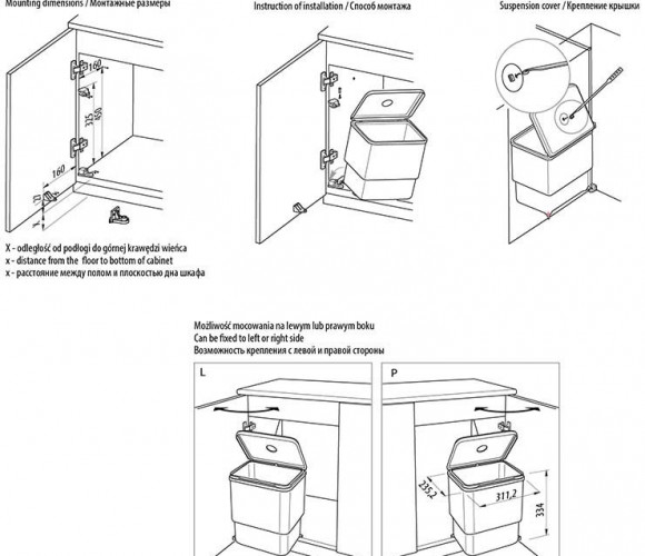 Ведро может быть установлено в шкафчике как с левой, так и с правой стороны.
