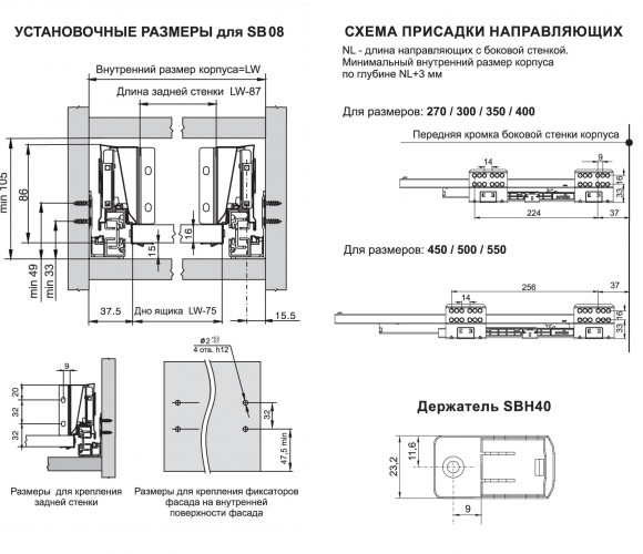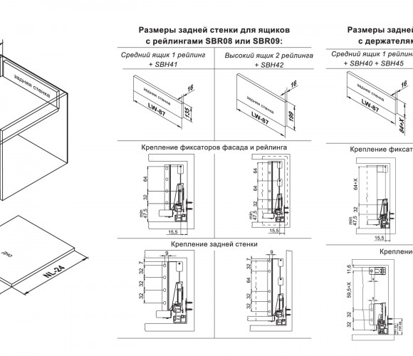 Для сборки выдвижного мебельного ящика с помощью боковых стенок SBDW08 необходимо самостоятельно изготовить фасад, заднюю стенку и дно ящика, изготовленные с учетом собственных пожеланий и потребностей по ширине и высоте готового ящика. Схема раскроя дна выдвижного мебельного ящика соответствует уже зарекомендовавшей себя популярной системе B-BOX SB04 и европейским аналогам.