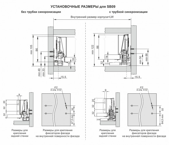 Комплект SB09 включает в себя: направляющие (левая и правая), детали для установки трубки синхронизации с крепежом, держатели задней стенки, традиционные боковые стенки, фиксаторы фасада, заглушки, крепёж.