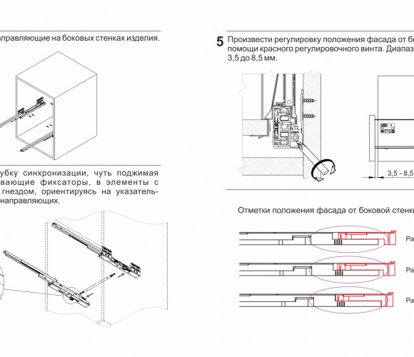 Конструкция СТАРТ PUSH SB09 имеет регулировочный красный винт — он позволяет выровнять фасады по глубине и компенсировать погрешности производства и монтажа. Специальные риски на направляющей помогут выставить одинаковое положение регулировки на обеих направляющих (левой и правой).