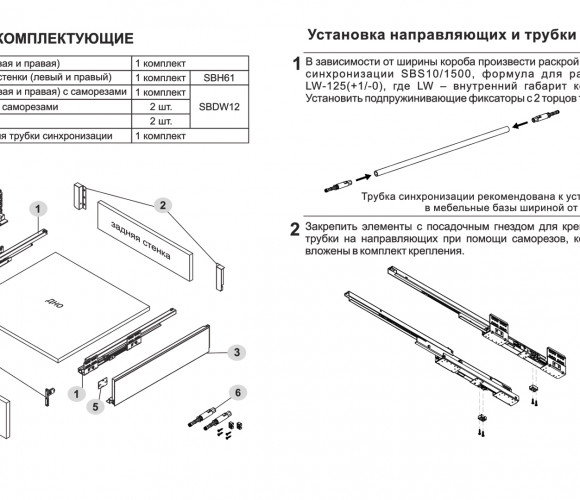 Комплект SB29 включает в себя: направляющие (левая и правая), детали для установки трубки синхронизации с крепежом, держатели задней стенки, традиционные боковые стенки, фиксаторы фасада, заглушки, крепёж.