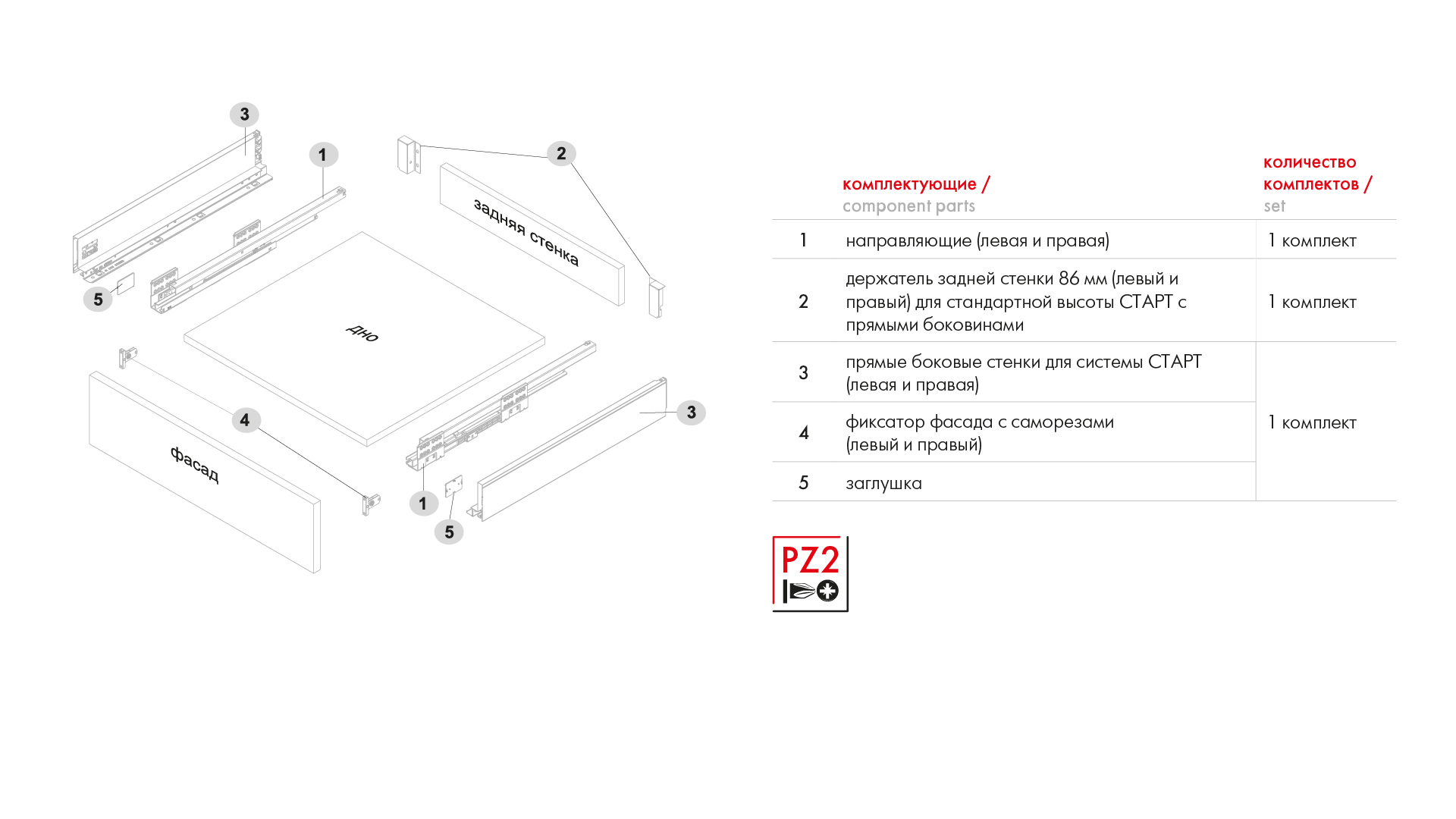 СТАРТ SB18 – комплект систем выдвижения для сборки выдвижного мебельного ящика с прямыми боковинами стандартной высоты 86 мм для минимальной высоты проёма 115 мм. Комплект включает в себя направляющие, прямые боковины, держатели фасада и задней стенки, заглушки с логотипом BOYARD и необходимый крепёж.