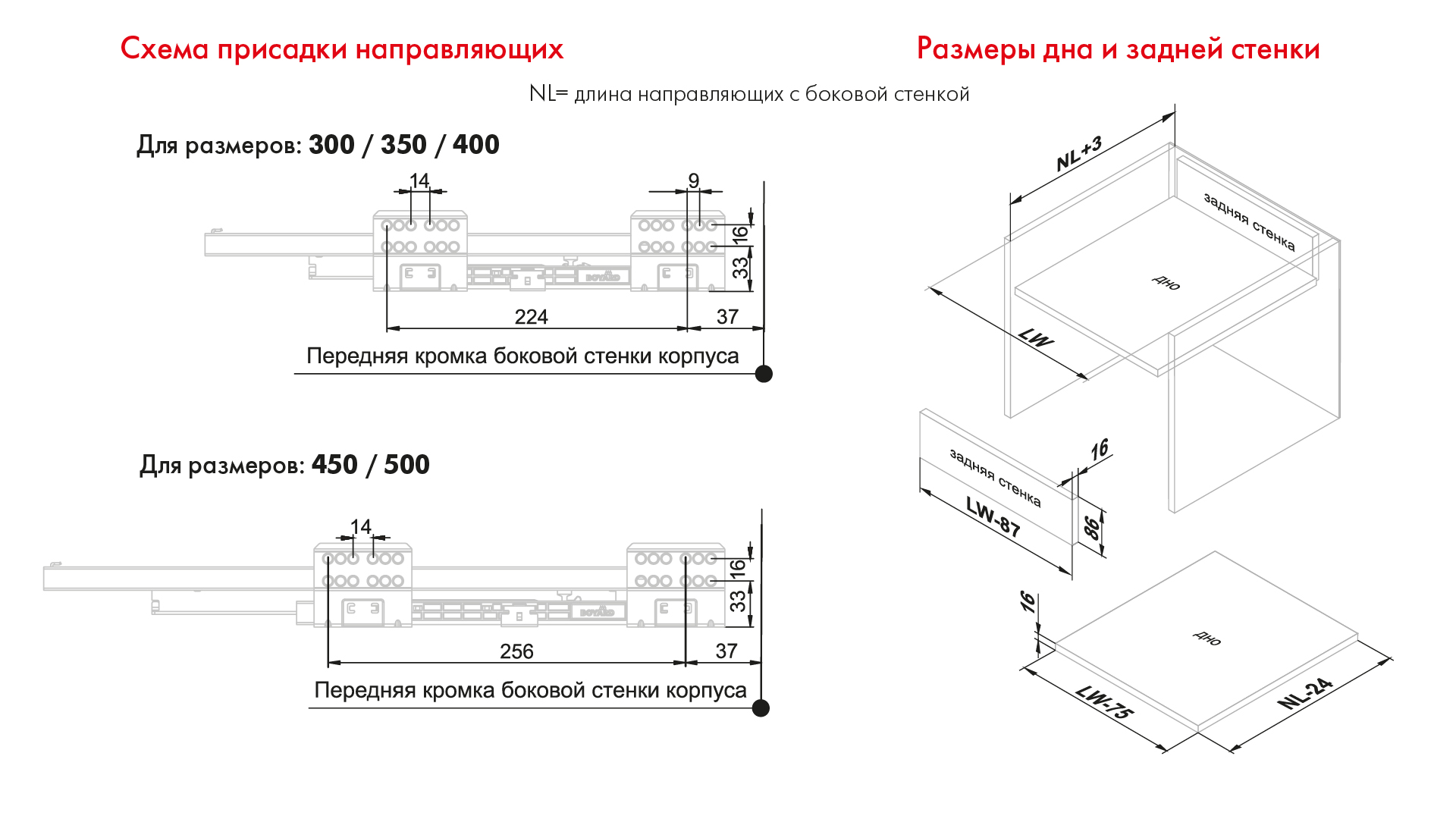 Для сборки выдвижного мебельного ящика на базе СТАРТ SB18 необходимо самостоятельно изготовить фасад, заднюю стенку и дно ящика.