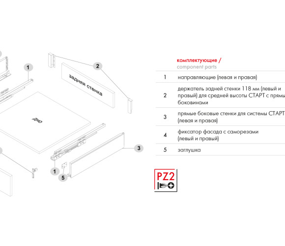 СТАРТ SB19 – комплект систем выдвижения для сборки выдвижного мебельного ящика с прямыми боковинами средней высоты 118 мм для минимальной высоты проёма 147 мм. Комплект включает в себя направляющие, прямые боковины, держатели фасада и задней стенки, заглушки с логотипом BOYARD и необходимый крепёж.