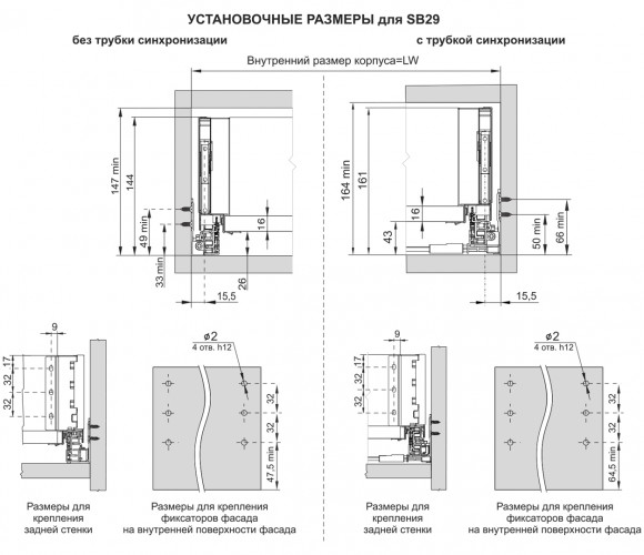Комплект SB29 включает в себя: направляющие (левая и правая), детали для установки трубки синхронизации с крепежом, держатели задней стенки, традиционные боковые стенки, фиксаторы фасада, заглушки, крепёж.
