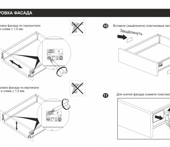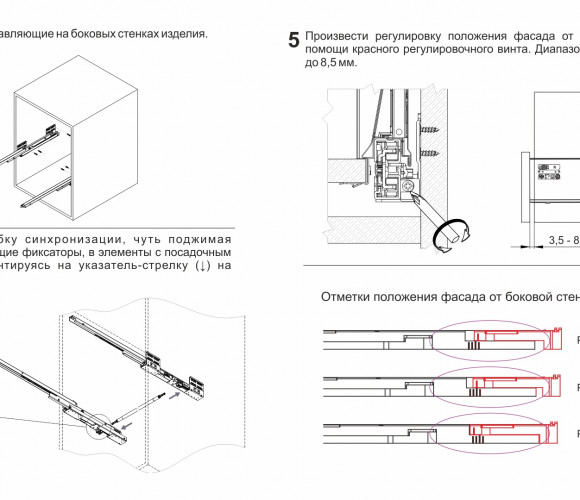 Конструкция СТАРТ PUSH SB29 имеет регулировочный красный винт — он позволяет выровнять фасады по глубине и компенсировать погрешности производства и монтажа. Специальные риски на направляющей помогут выставить одинаковое положение регулировки на обеих направляющих (левой и правой).