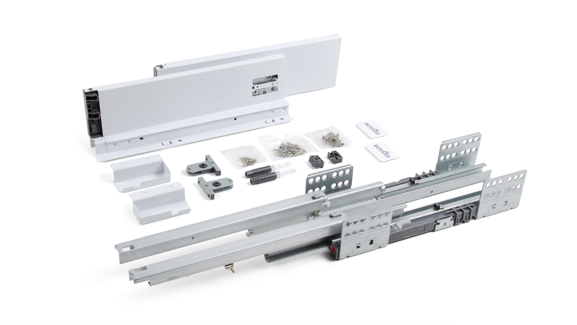 Комплект SB28 включает в себя: направляющие (левая и правая), детали для установки трубки синхронизации с крепежом, держатели задней стенки, традиционные боковые стенки, фиксаторы фасада, заглушки, крепёж.