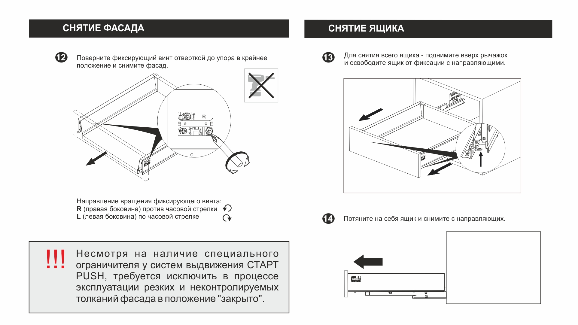 Модель эксклюзивно имеет специальный ограничитель механизма PUSH, что позволит избежать поломки системы выдвижения в процессе установки ящика на направляющие с прилагаемым усилием. Ограничитель также выполняет функцию упора для вкладных ящиков.