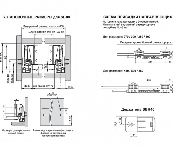 SBH40 – держатель рейлинга к задней стенке выдвижного мебельного ящика. Продукт предназначен для надёжной фиксации и установки прямоугольного (SBR09) рейлинга в графитовом цвете для  создания ящиков любой высоты с прямыми боковинами.