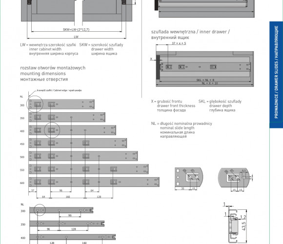 Направляющие шариковые PK-P-H45-500-GX с выталкивателем - функциональная фурнитура, механизмы для выдвижных ящиков, используемые в кухонных гарнитурах, гардеробных, офисной и специализированной мебели.