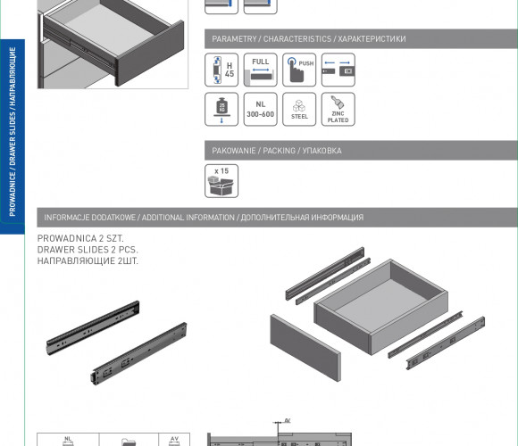Направляющие шариковые PK-P-H45-350-GX с выталкивателем - функциональная фурнитура, механизмы для выдвижных ящиков, используемые в кухонных гарнитурах, гардеробных, офисной и специализированной мебели.