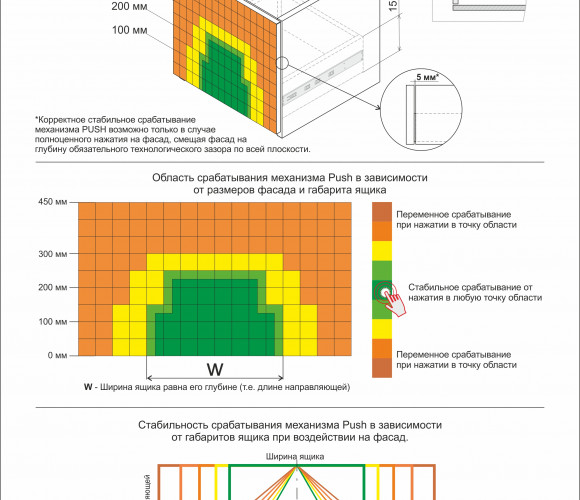 Ключевая особенность направляющих – инновационный механизм толкателя: при случайном открытии ящика без нажатия подвижная часть направляющей соскакивает с механизма и свободно выдвигается. Для установки ящика в исходное положение без повреждений достаточно задвинуть его обратно.