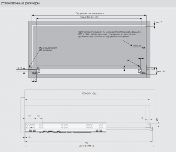 Возможность установки ящика с толщиной боковин толщиной до 19 мм