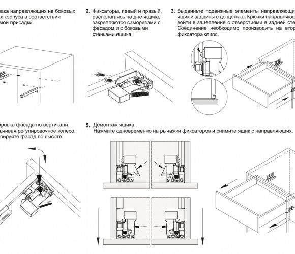 Направляющие обеспечивают комфортное движение, лёгкое открывание от нажатия на фасад и имеют защиту от случайного открывания «на себя» на протяжении 100 открываний.