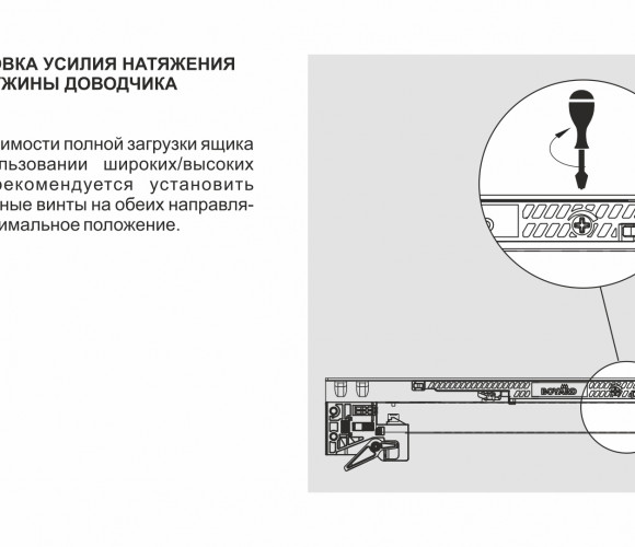 - Adapt-auto — адаптивная регулировка усилия работы доводчика — уникальное технологическое решение BOYARD, которое позволяет легко и быстро «в домашних условиях» ослабить или усилить натяжение пружины доводчика. Опция Adapt-auto незаменима в случае нестандартной нагрузки, когда неглубокий ящик имеет высокий и тяжелый фасад, или же когда груз внутри ящика распределен ближе к фасаду. В случае многолетней активной эксплуатации мебели пружину доводчика можно подтянуть и доводчик будет работать как в день установки направляющих. Усиливать или облегчать натяжение пружины пользователи мебели могут самостоятельно, выставив подходящее положение регулировочного винта в доводчике при помощи обычной крестовой отвертки.