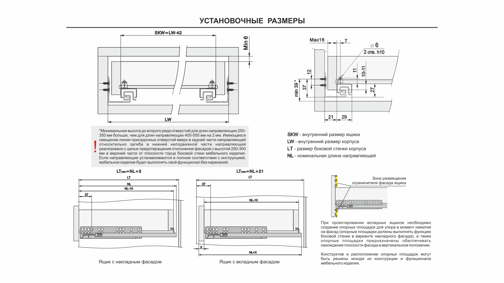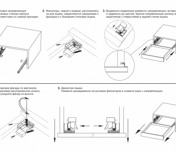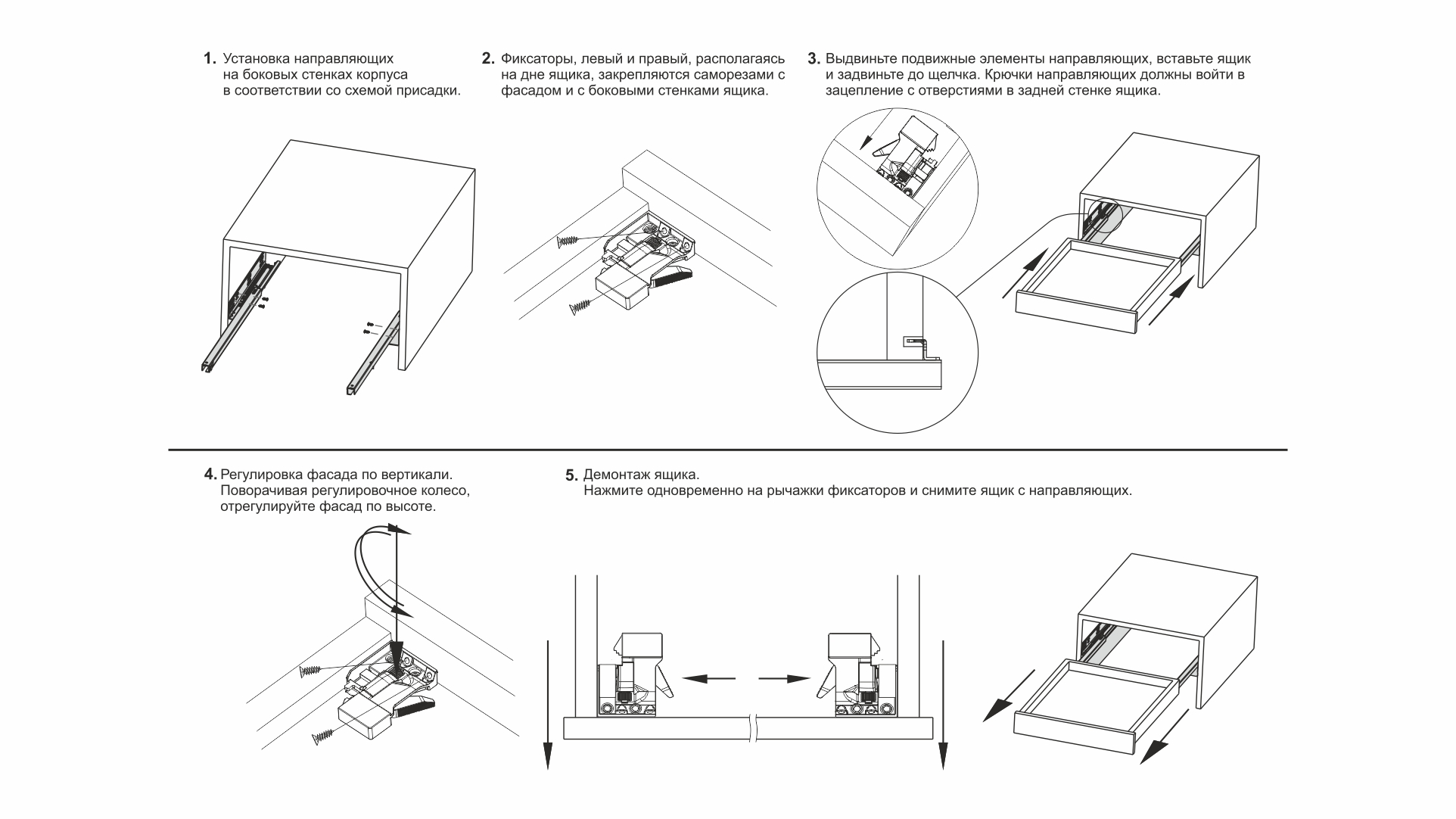 - Монтаж без зазоров между фасадом и корпусом при установке неглубоких (до 350 мм) ящиков. Обычно при монтаже неглубоких ящиков комодов и ванных тумб с направляющими скрытого монтажа полного выдвижения между фасадом и корпусом образуется небольшой, но заметный зазор. Продуманная конструкция B-Slide полностью исключает этот нюанс.