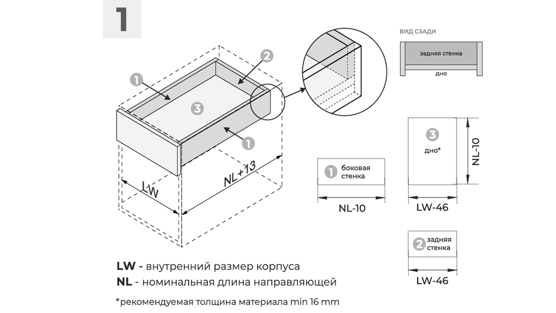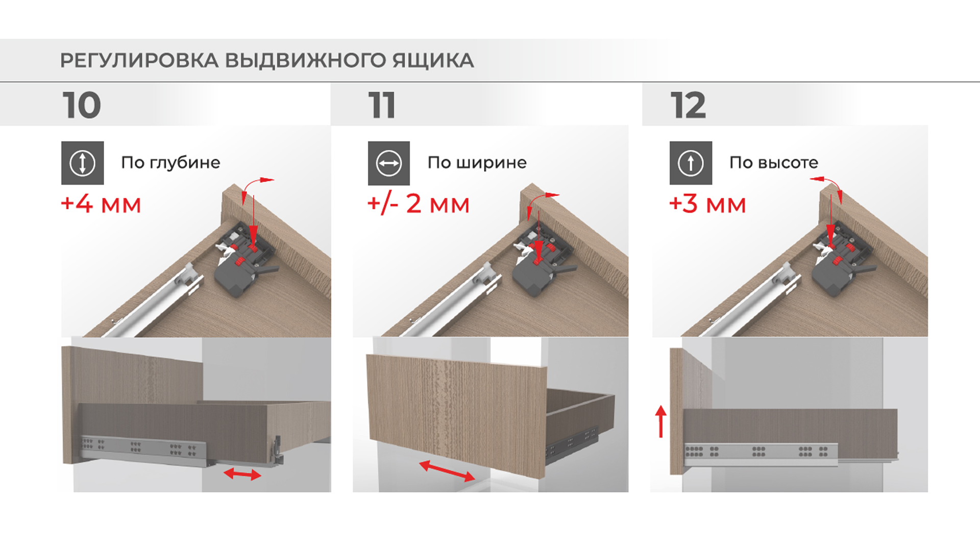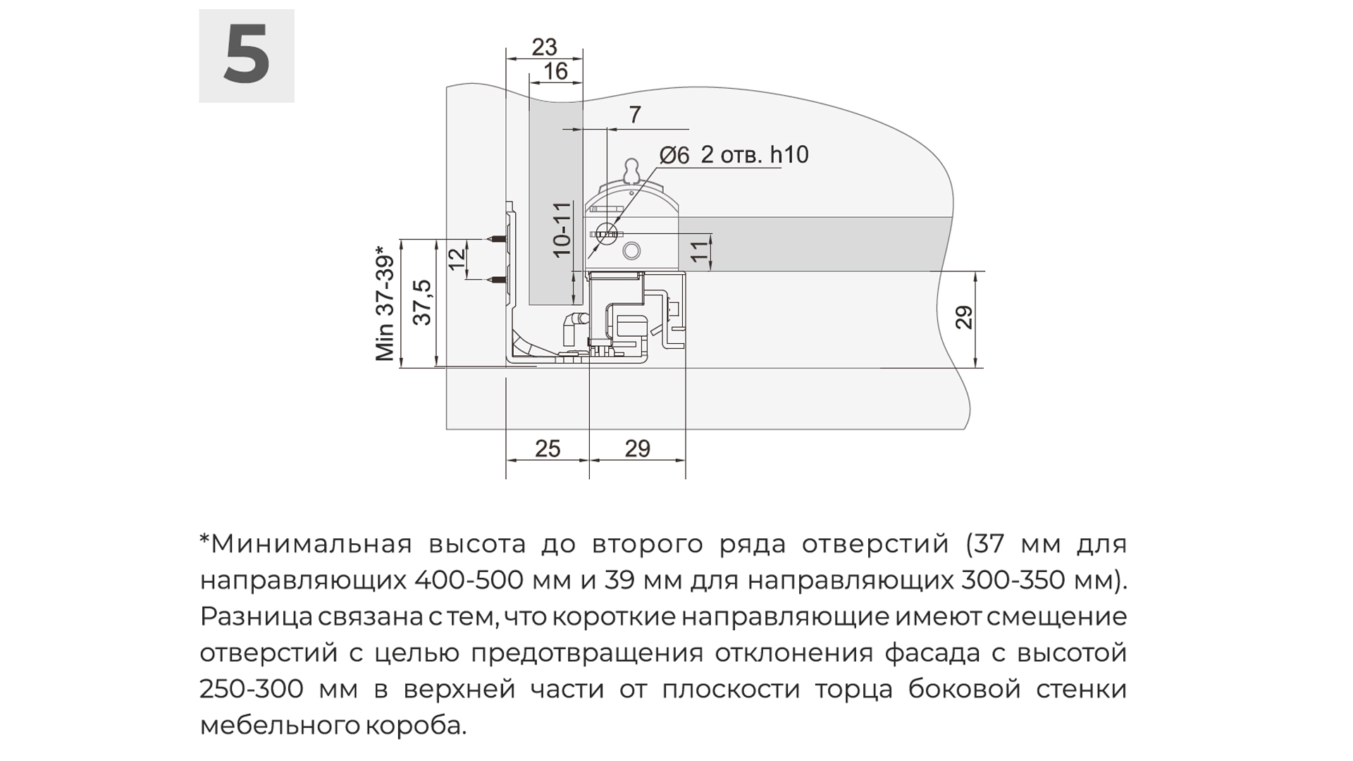 Разница в монтаже коротких и больших длин заключается в значении min отступа от дна мебельного корпуса до верхнего ряда присадочных отверстий направляющей. У неглубоких моделей, до 350 мм включительно, это значение составляет min 39 мм. Установка по схеме позволяет достичь зазора в 2 мм между мебельным корпусом и направляющей. Именно корректный монтаж в соответствие со схемой позволяет избежать отклонения фасада с высотой 250-300 мм в верхней части от плоскости торца боковой стенки мебельного изделия.
