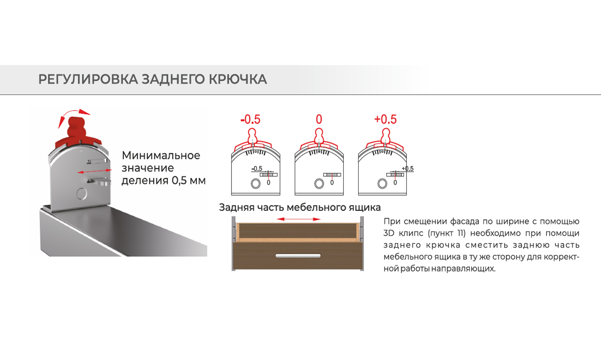 B-Slide DB9991 — направляющие скрытого монтажа полного выдвижения с 3D-регулировкой и синхронизацией. Реальная корректная и полноценная 3d-регулировка с помощью клипсы и подвижного заднего крючка позволит легко уточнить положение мебельного ящика или компенсировать возможные погрешности монтажа без применения доп. инструмента и без ухудшений параметров комфортного хода.
