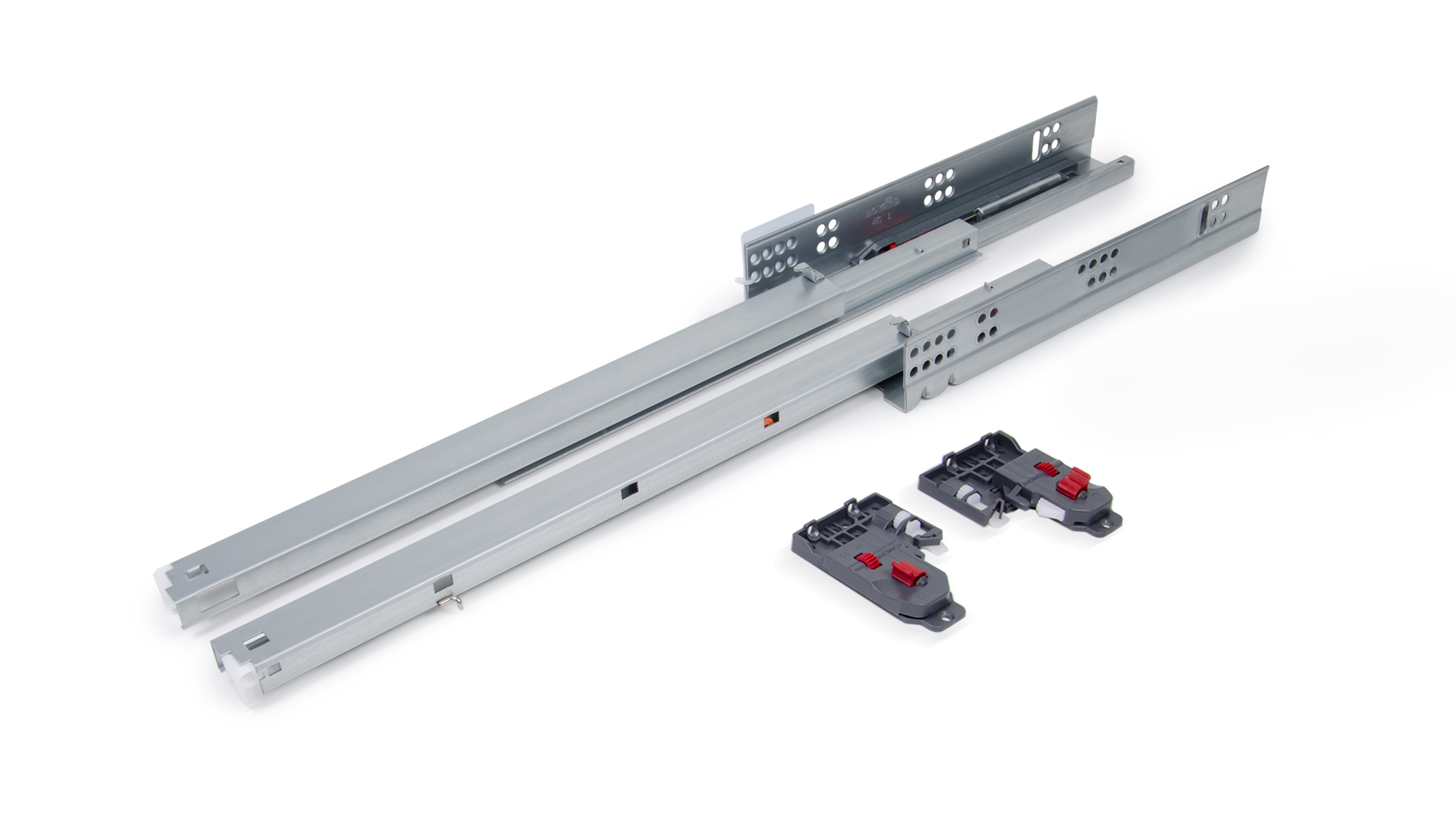 B-Slide DB8781 — базовые направляющие скрытого монтажа полного выдвижения с плавным доведением и выверенным набором опций и возможностей для мебельных производителей.