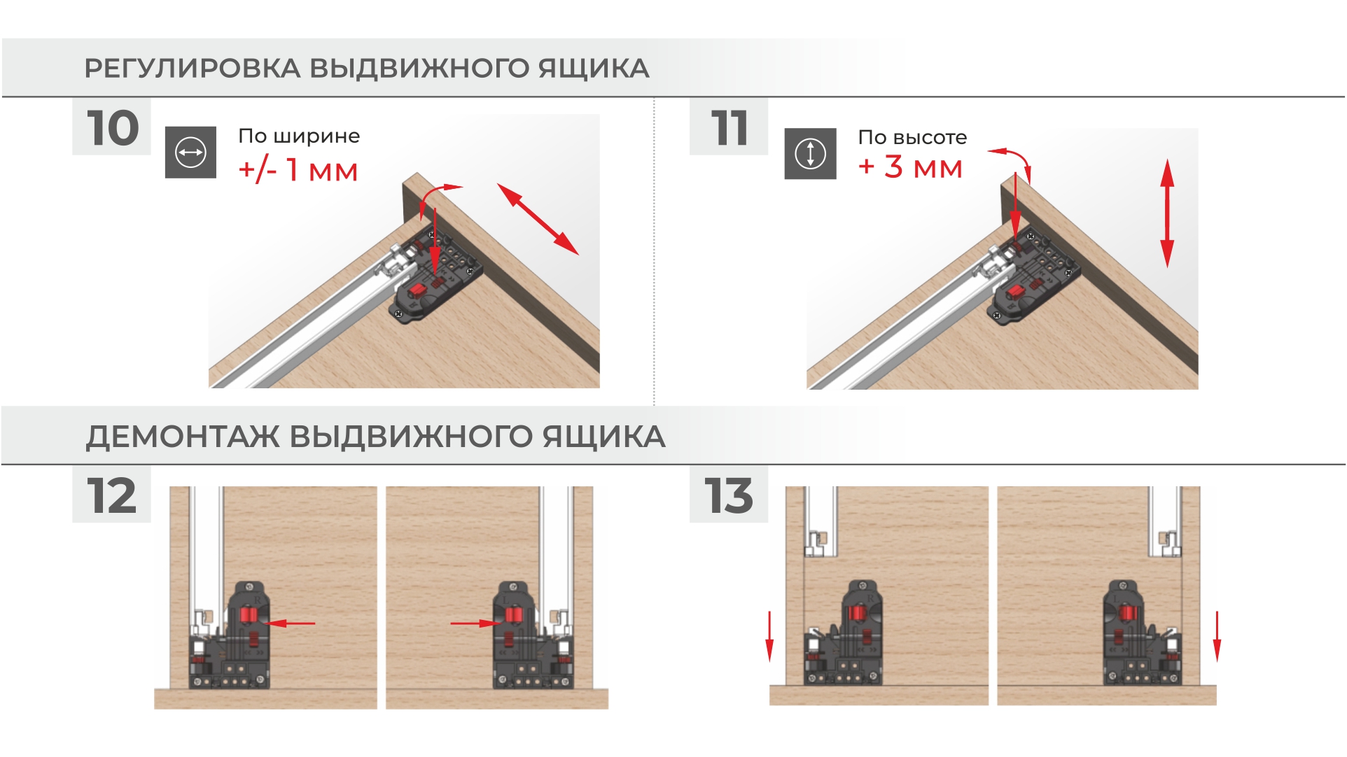 • простой монтаж выдвижного ящика на направляющие и быстрый демонтаж;