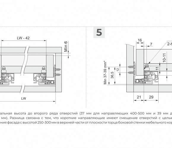 В коротких длинах направляющих DB8781 (250-350 мм) предусмотрено смещение оси присадочных отверстий. Это обеспечивает точное и плотное прилегание фасадов к боковинам мебельного корпуса, даже если неглубокий выдвижной ящик устанавливается с габаритными, высокими фасадами.